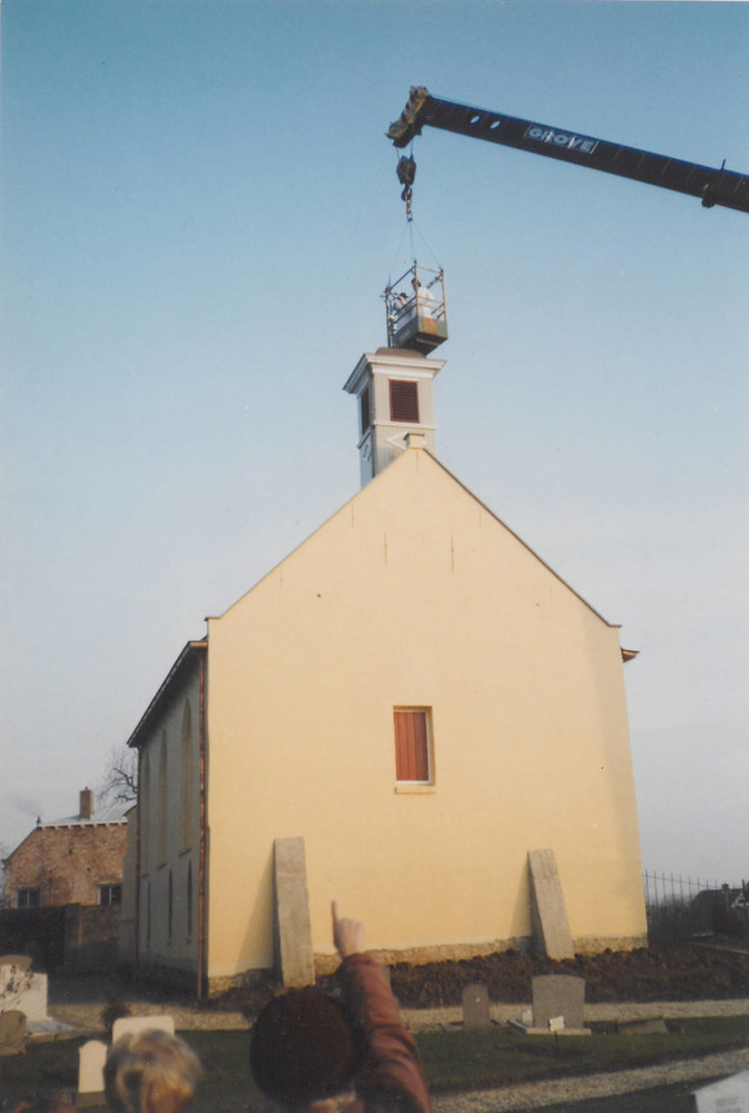 Restauratie kerk, plaatsing haantje.