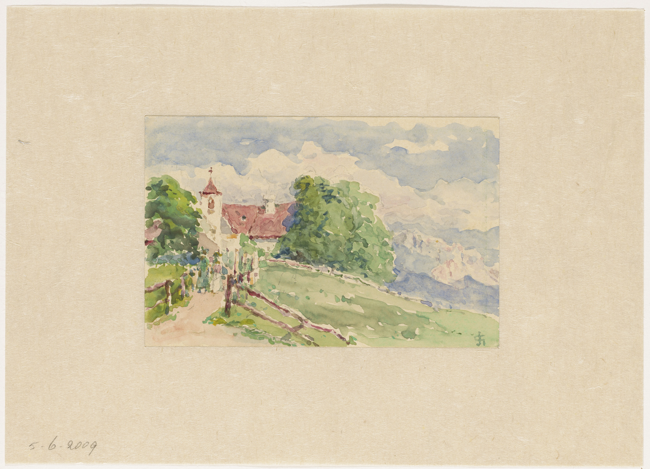 Oberbozen, een smalle weg leidt naar een kerkje op e...