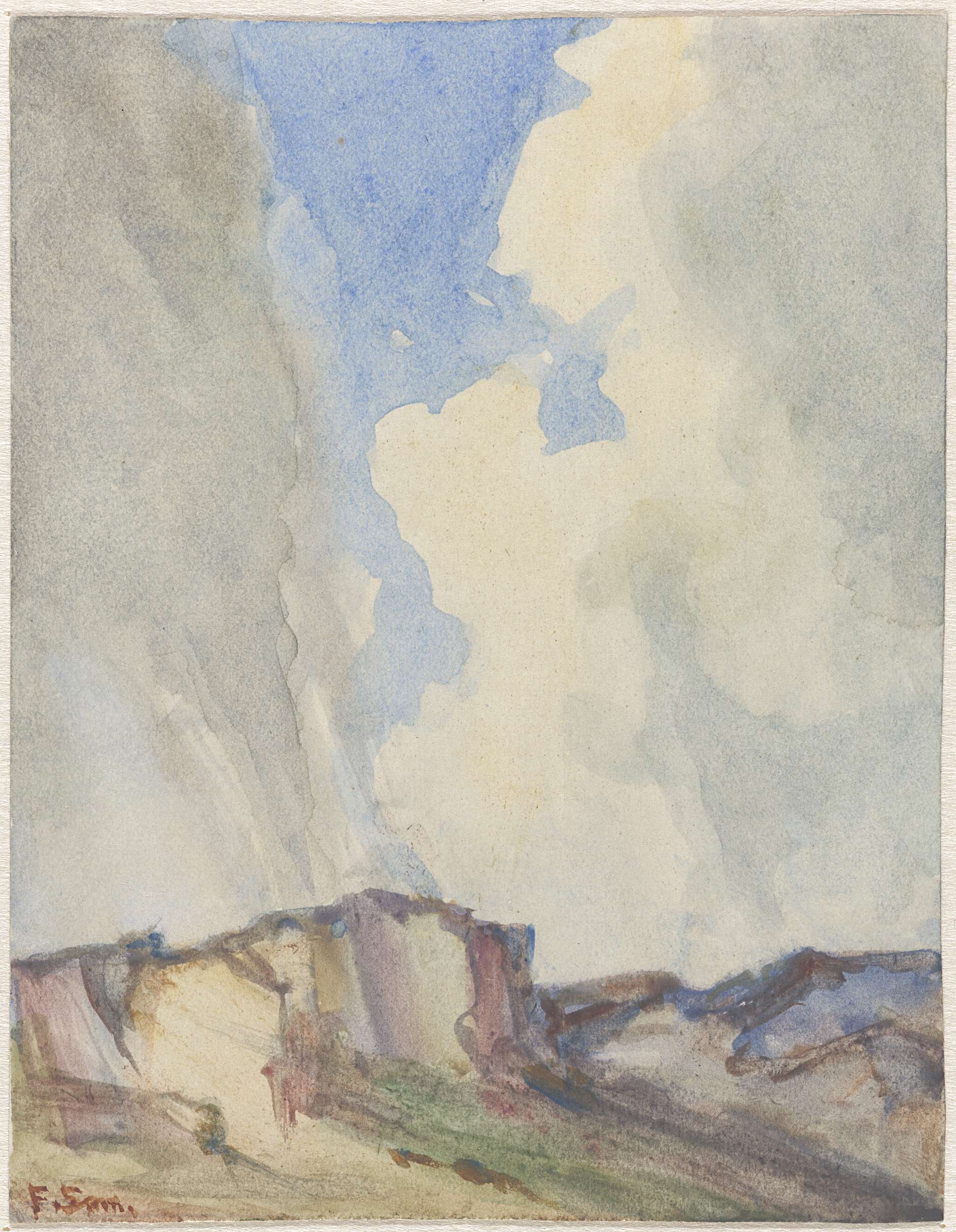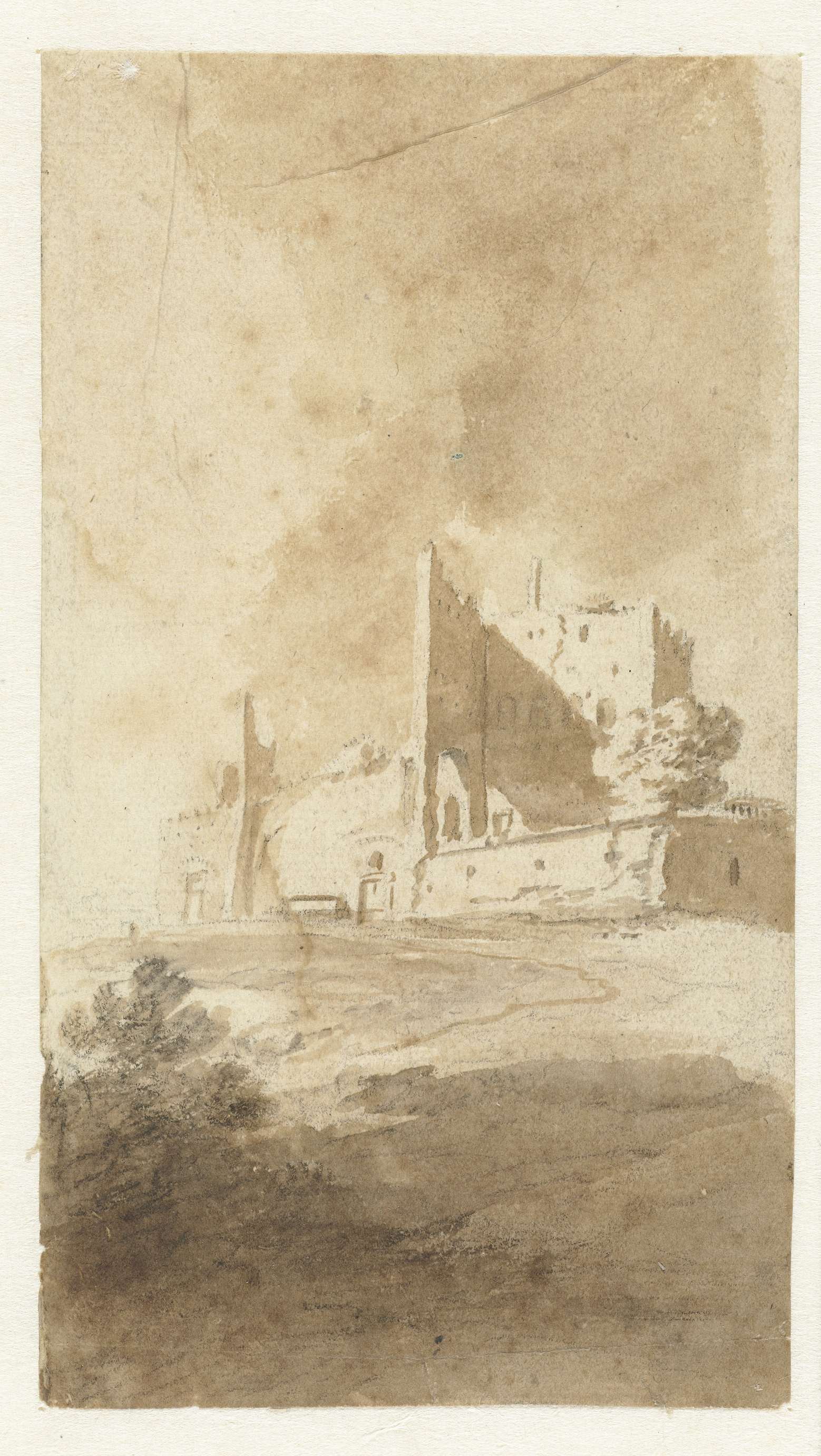 Berglandschap met gebouw, met op de voorgrond een pa...