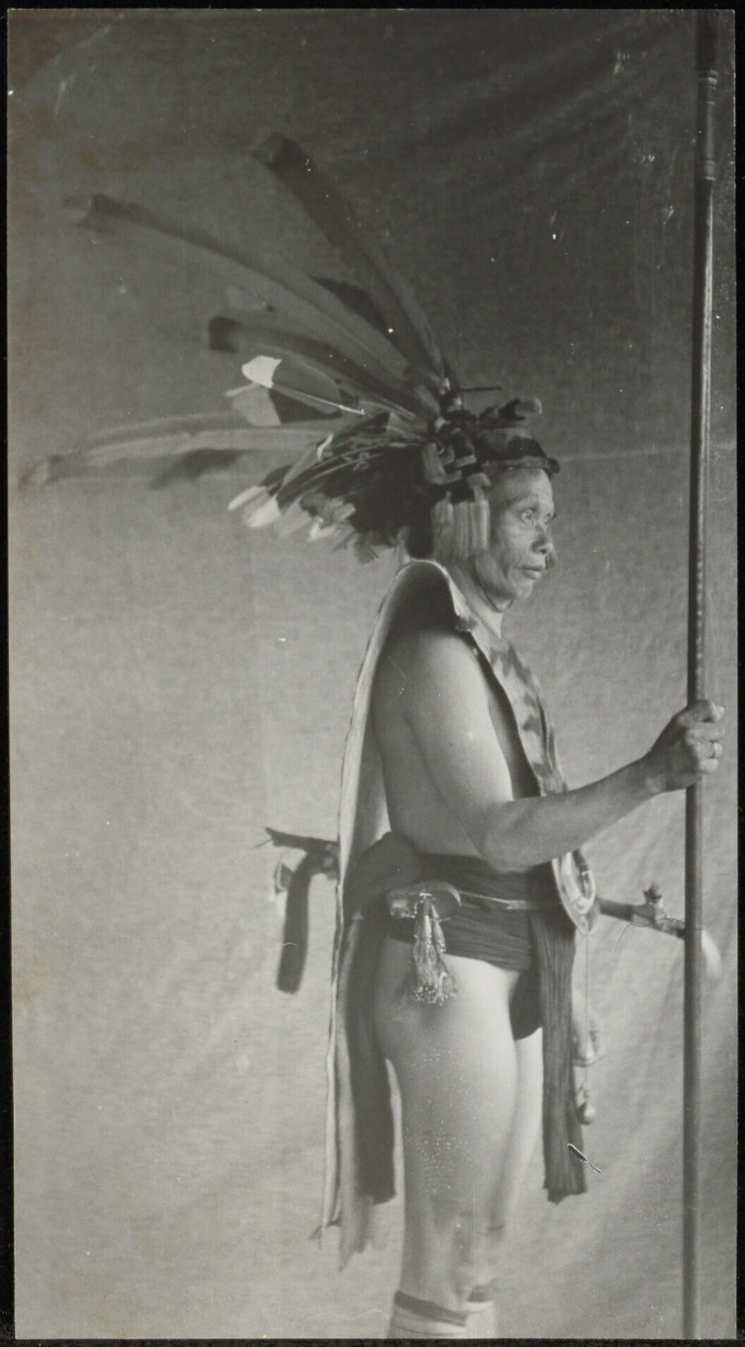 Krijger met mantel, lendendoek, een hoofdtooi van la...