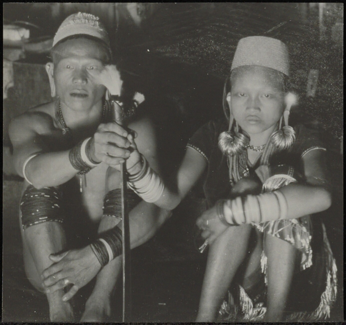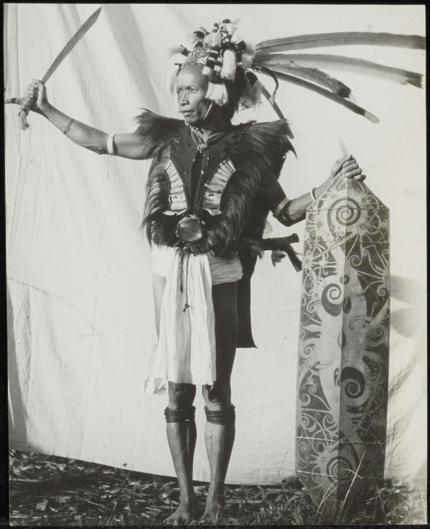 Twee krijgers in vol ornaat met lans, schild en mandau