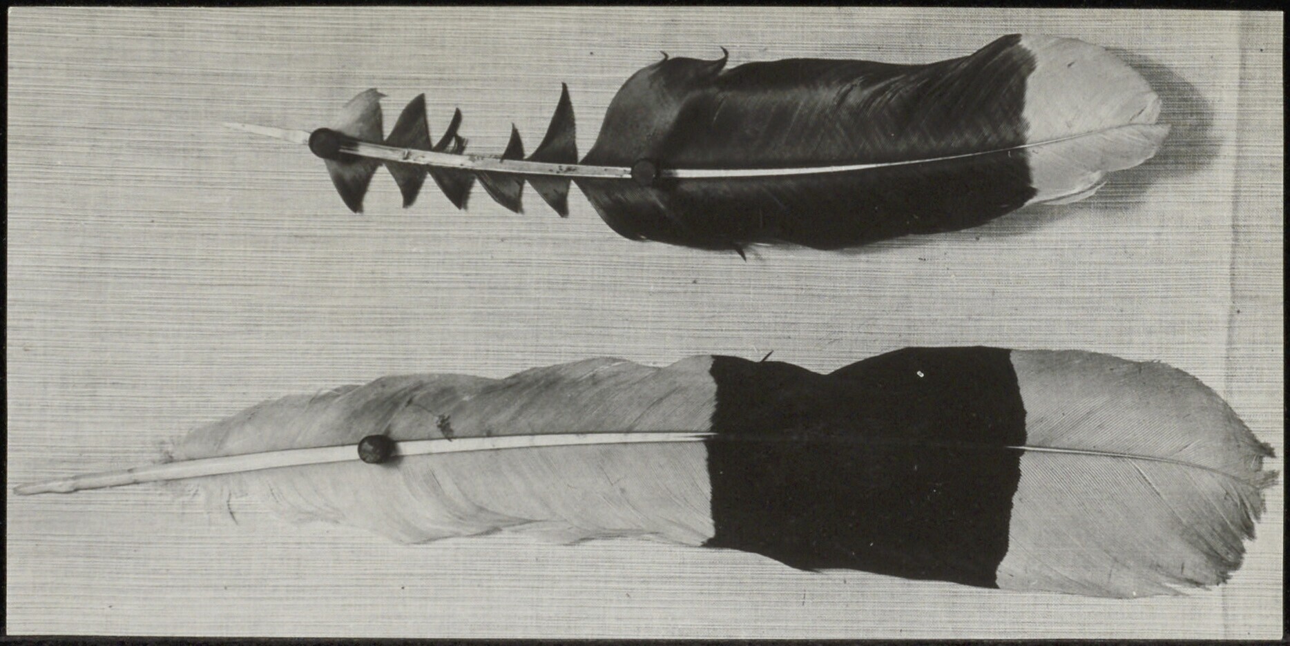 Twee veren waarvan er een gedeeltelijk is bewerkt