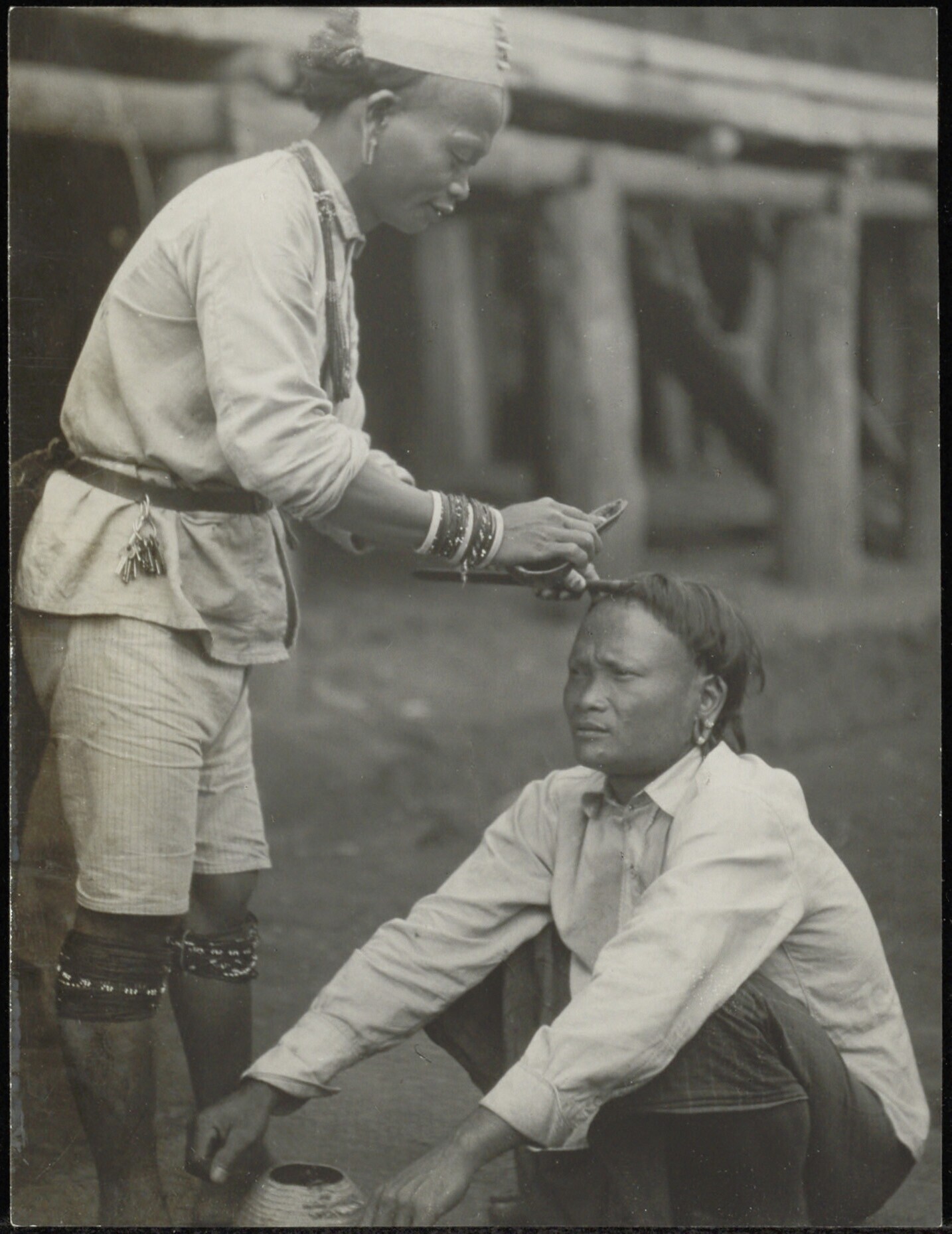 Dayak man bezig met het afsnijden van het hoofdhaar ...