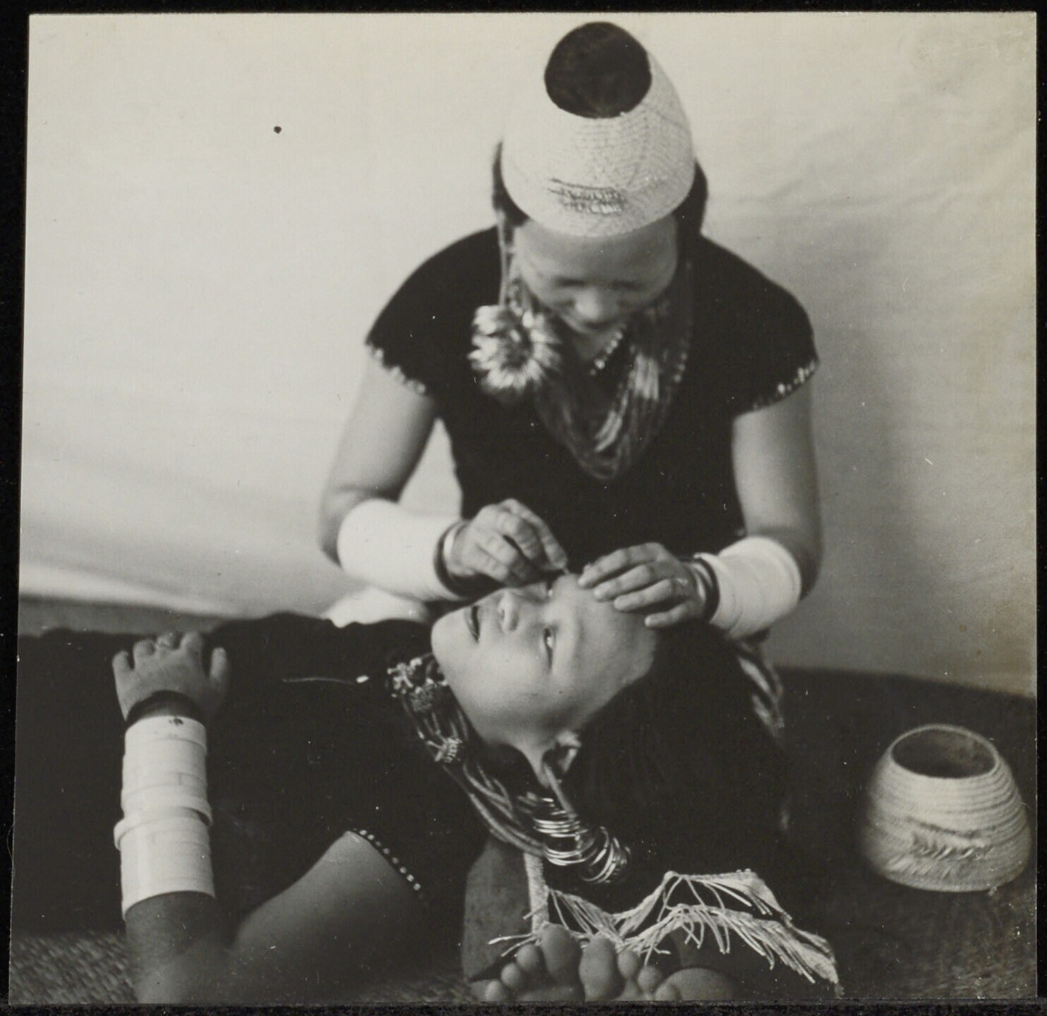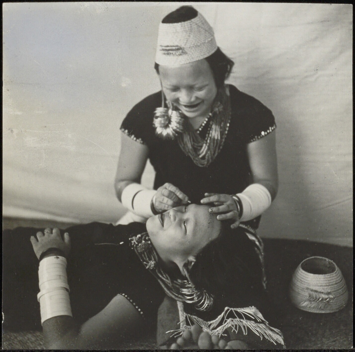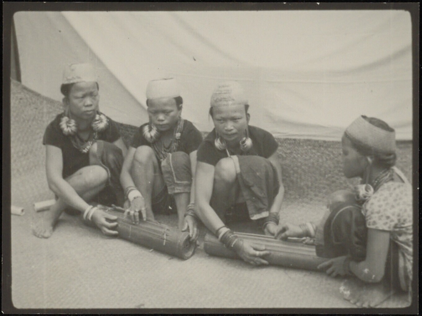 Gehurkt naast elkaar zittende vrouwen met twee snaar...