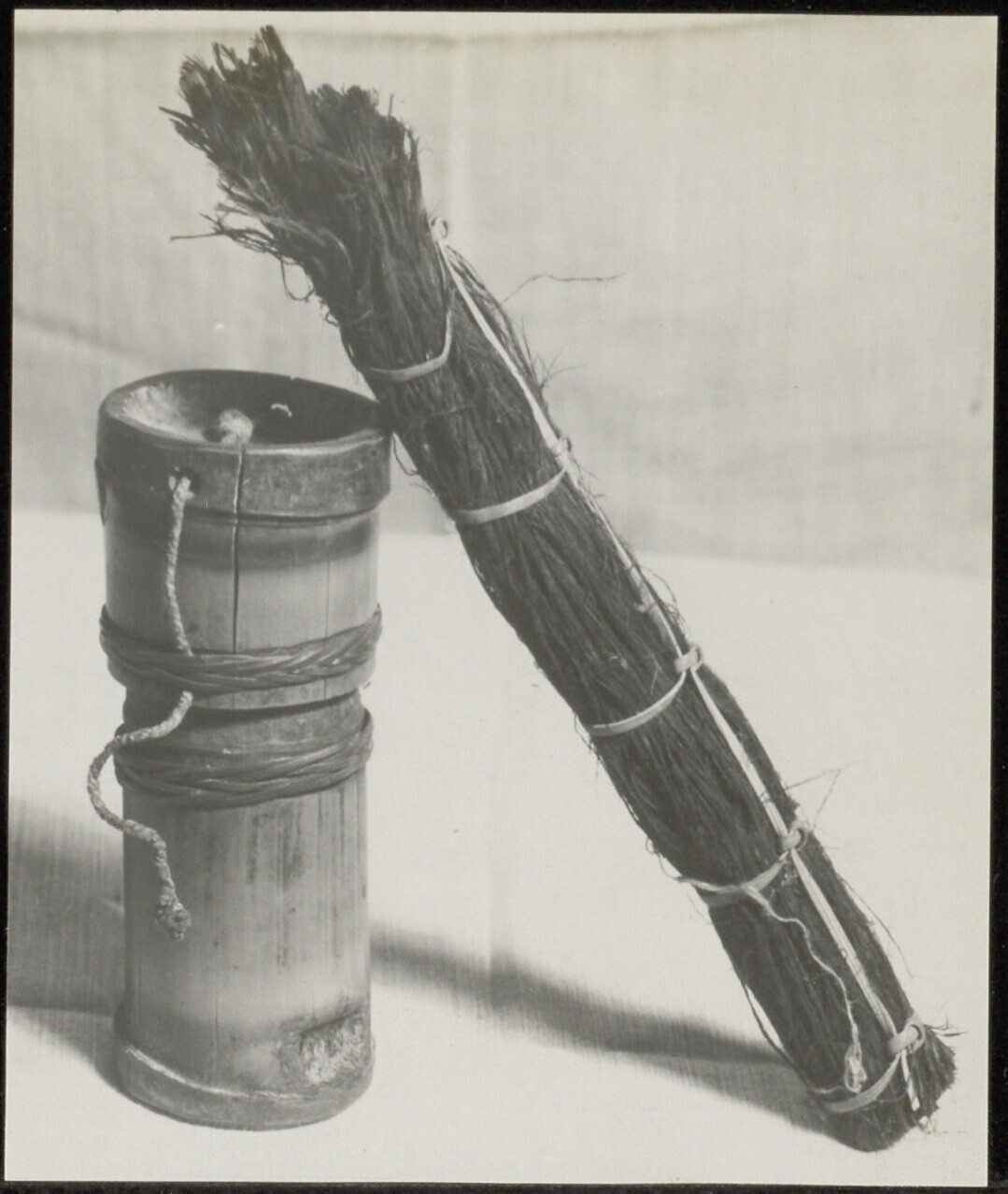 De benodigdheden van de vuurzaag. Koker van vlechtwe...