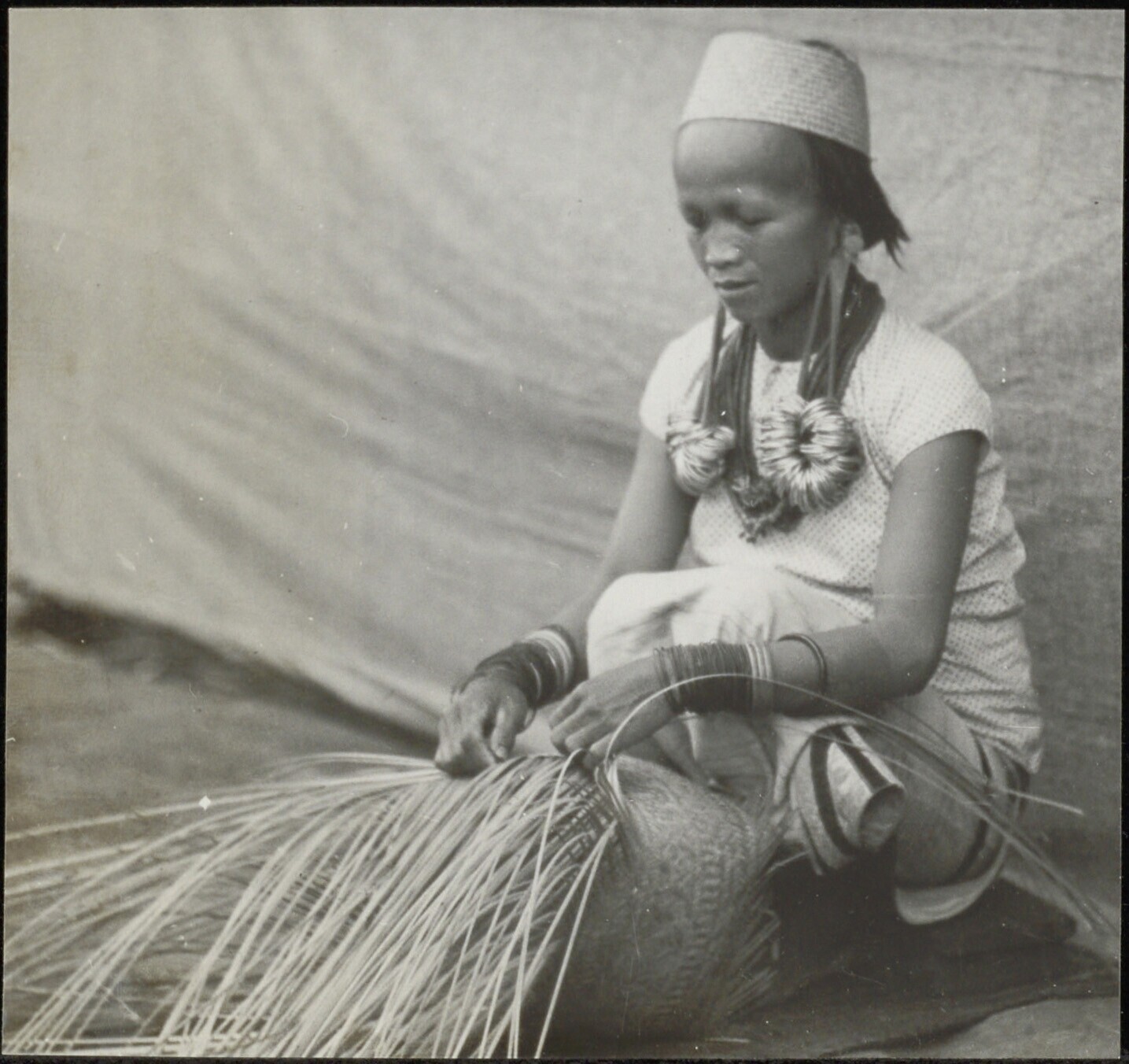 Een mandenvlechtster aan het werk