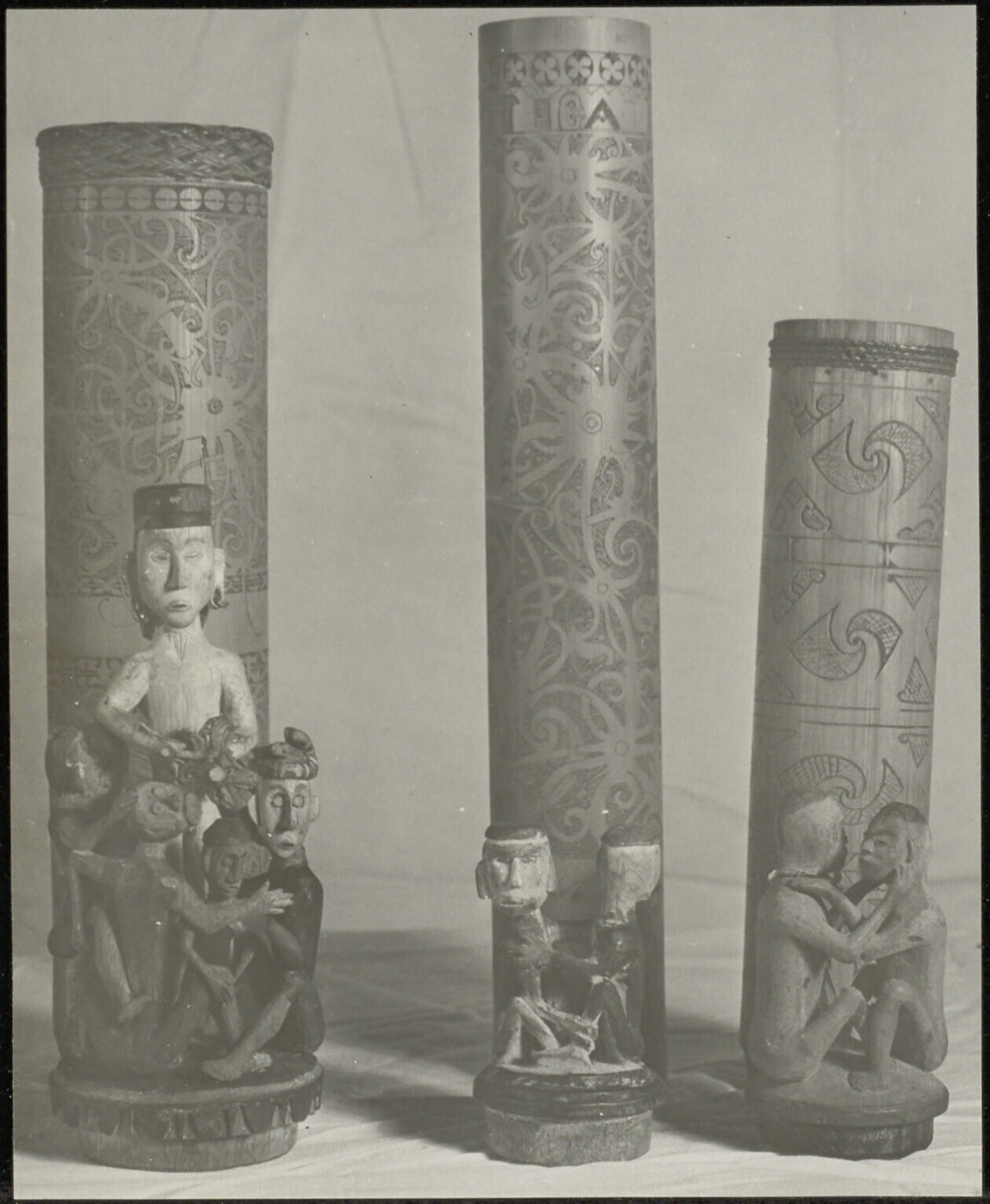 Twee bamboekokers met traditionele motieven in snijw...