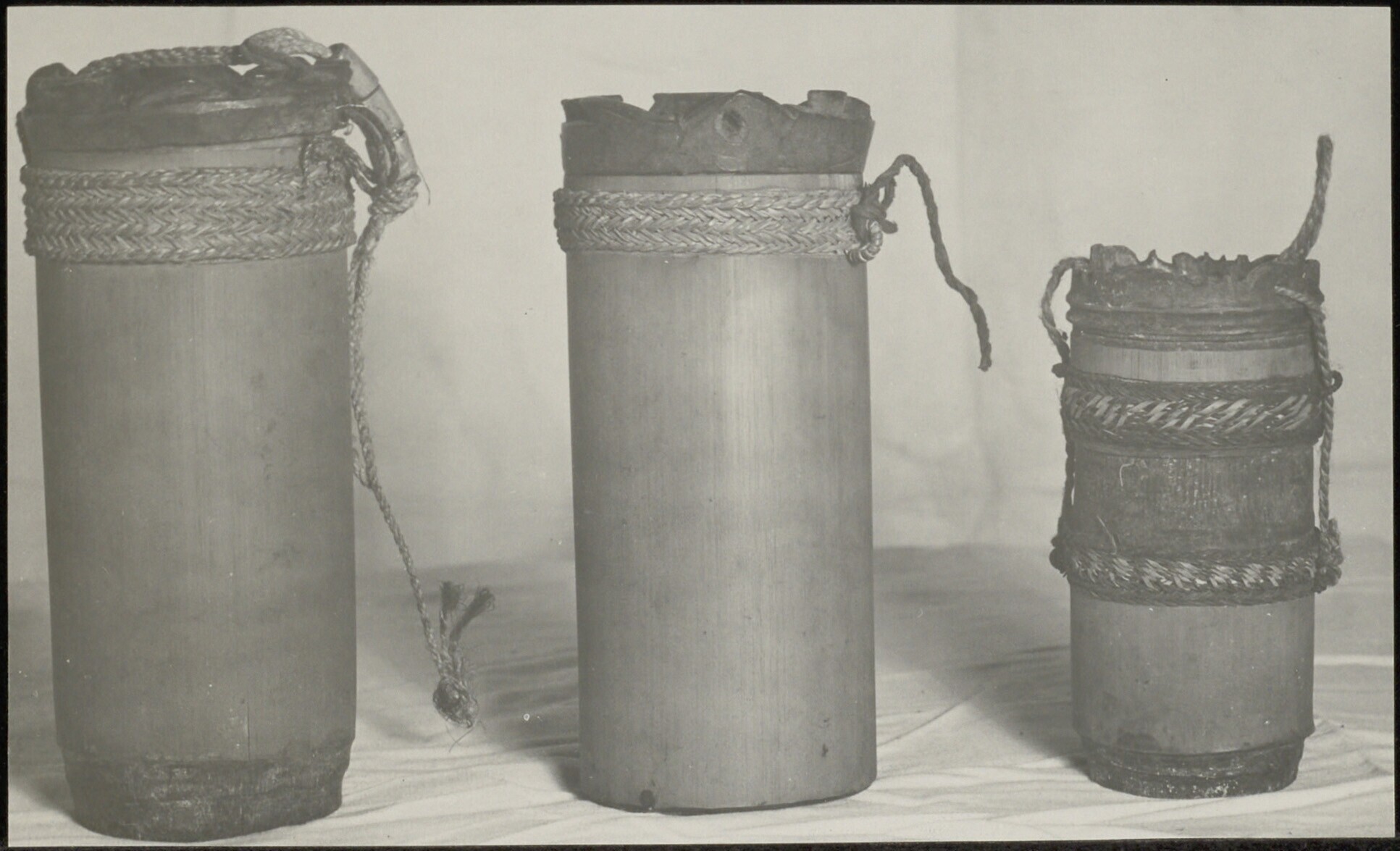 Drie bamboekokers met een versierd deksel en banden ...