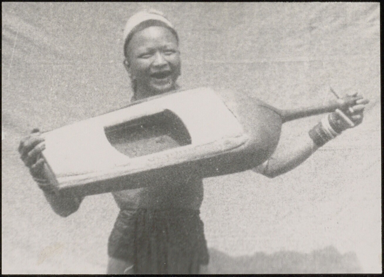 Mondstuk, gemaakt van een kalebas, en een lange bamb...