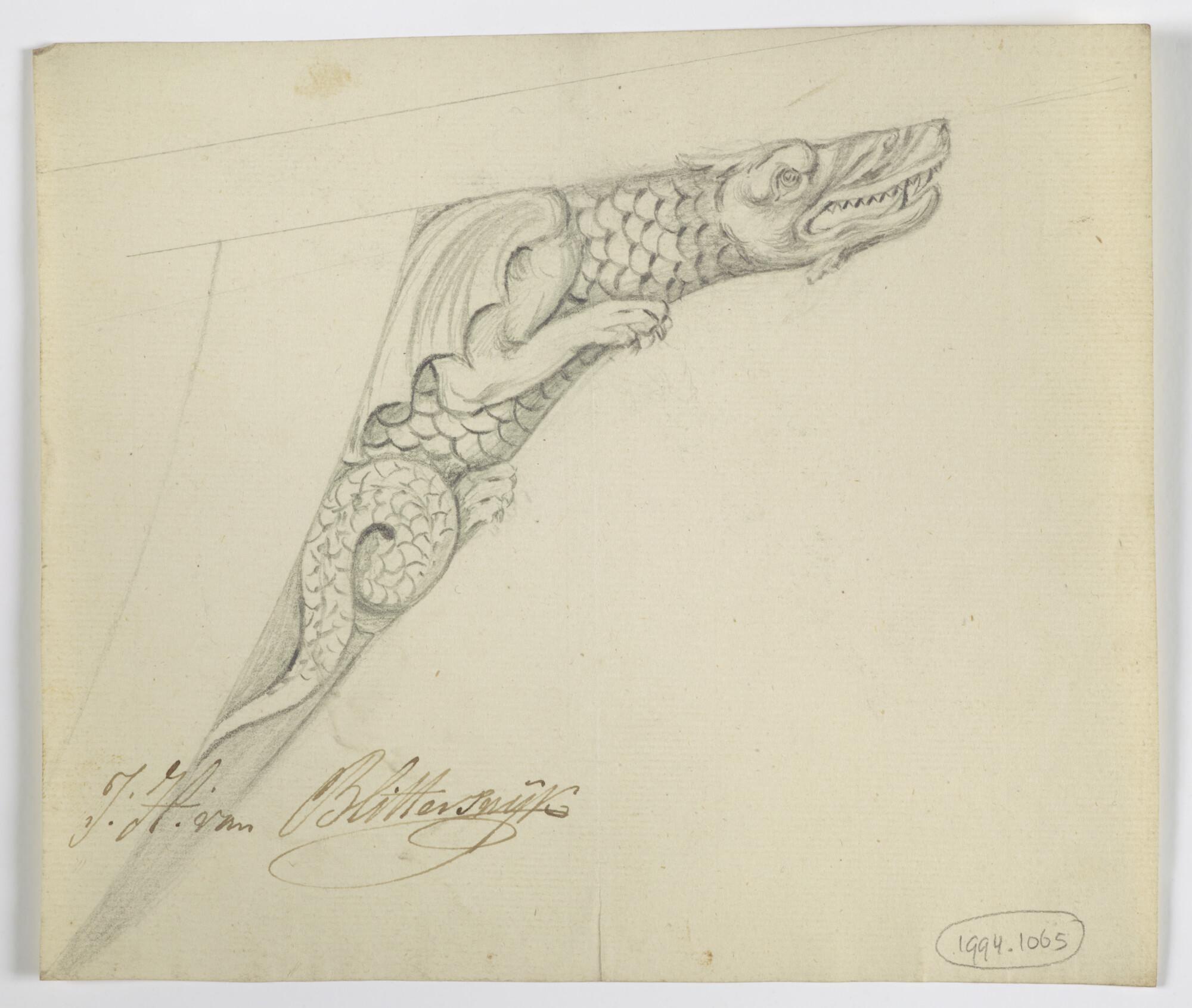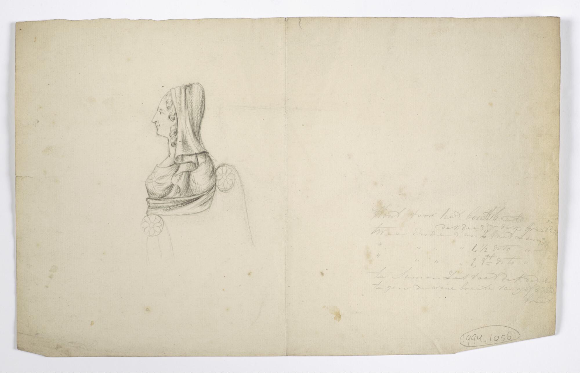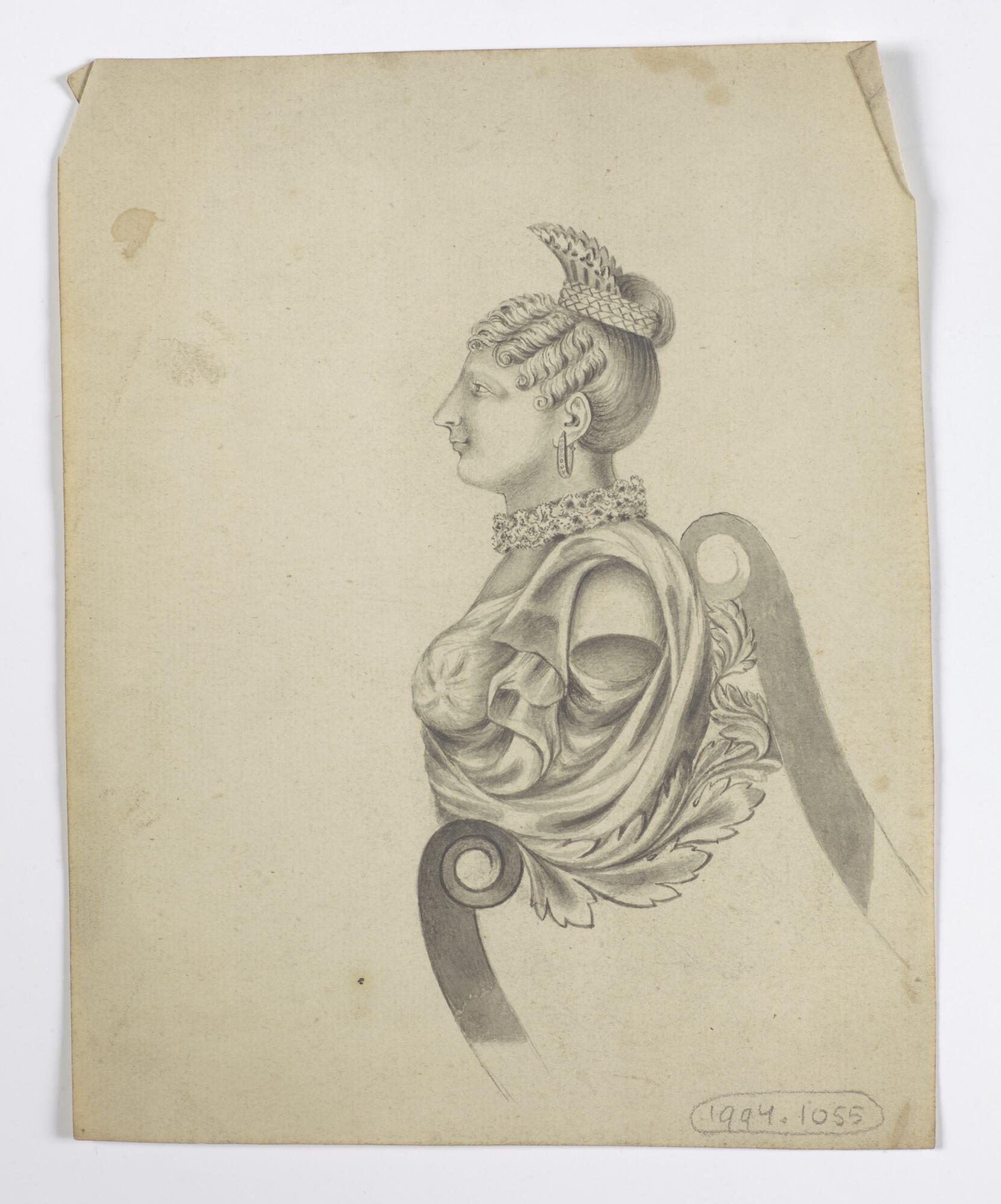 Tekening van boegbeeld met borstbeeld van een vrouw
