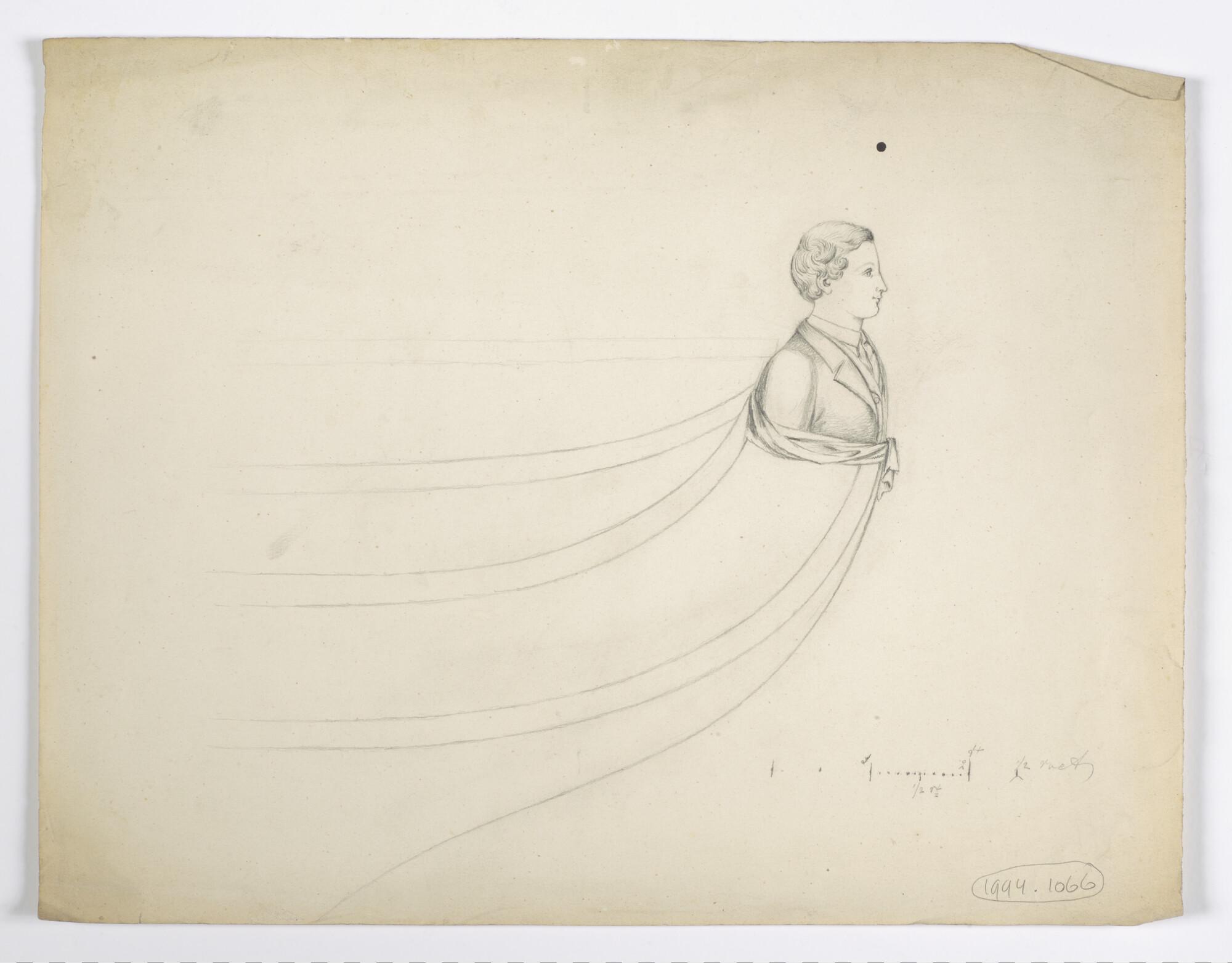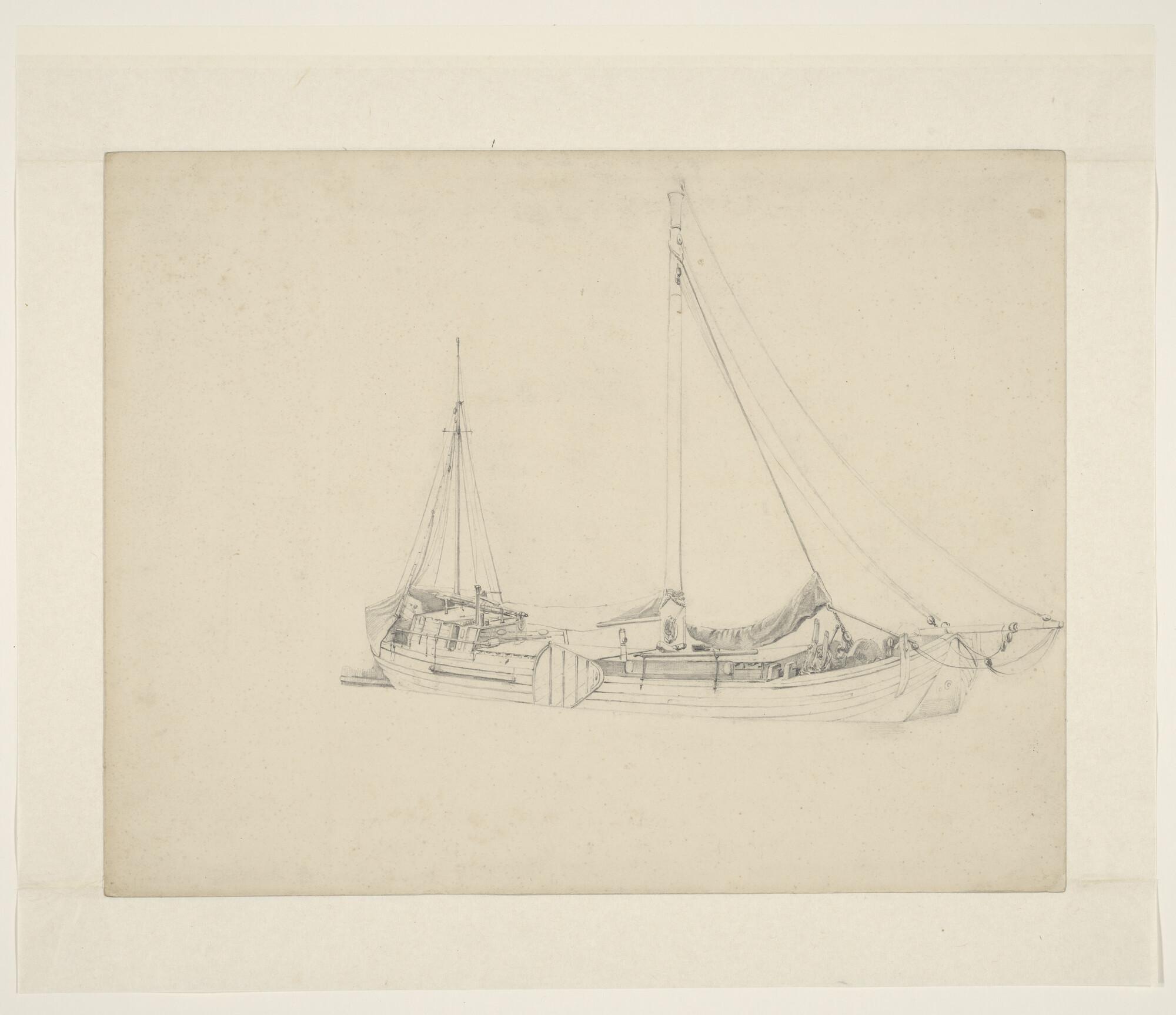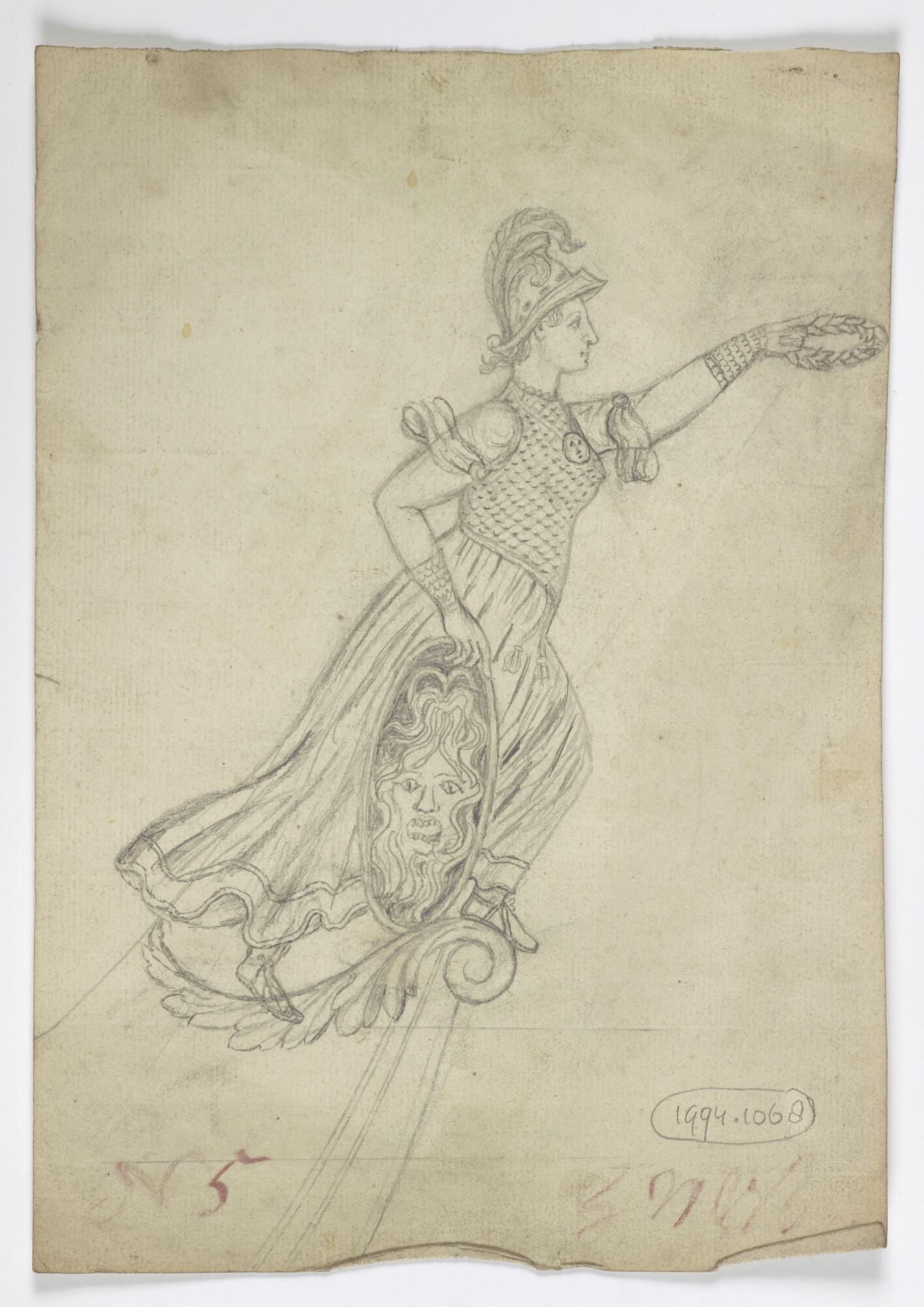 Tekening van boegbeeld met borstbeeld van een vrouw