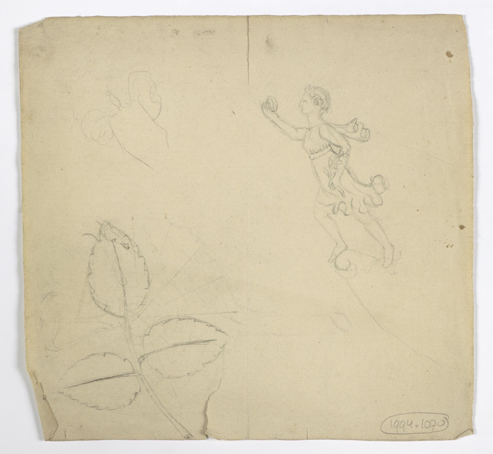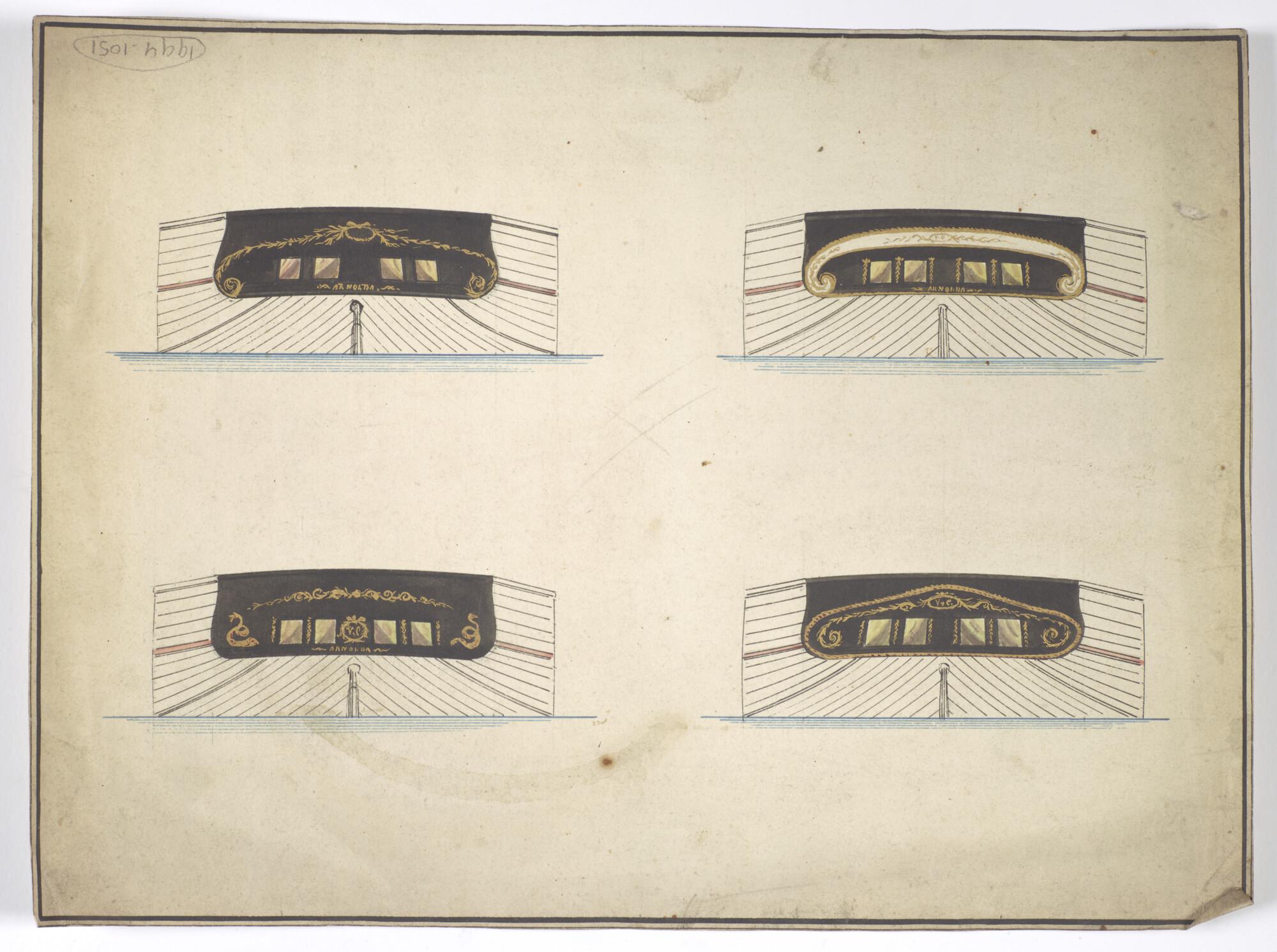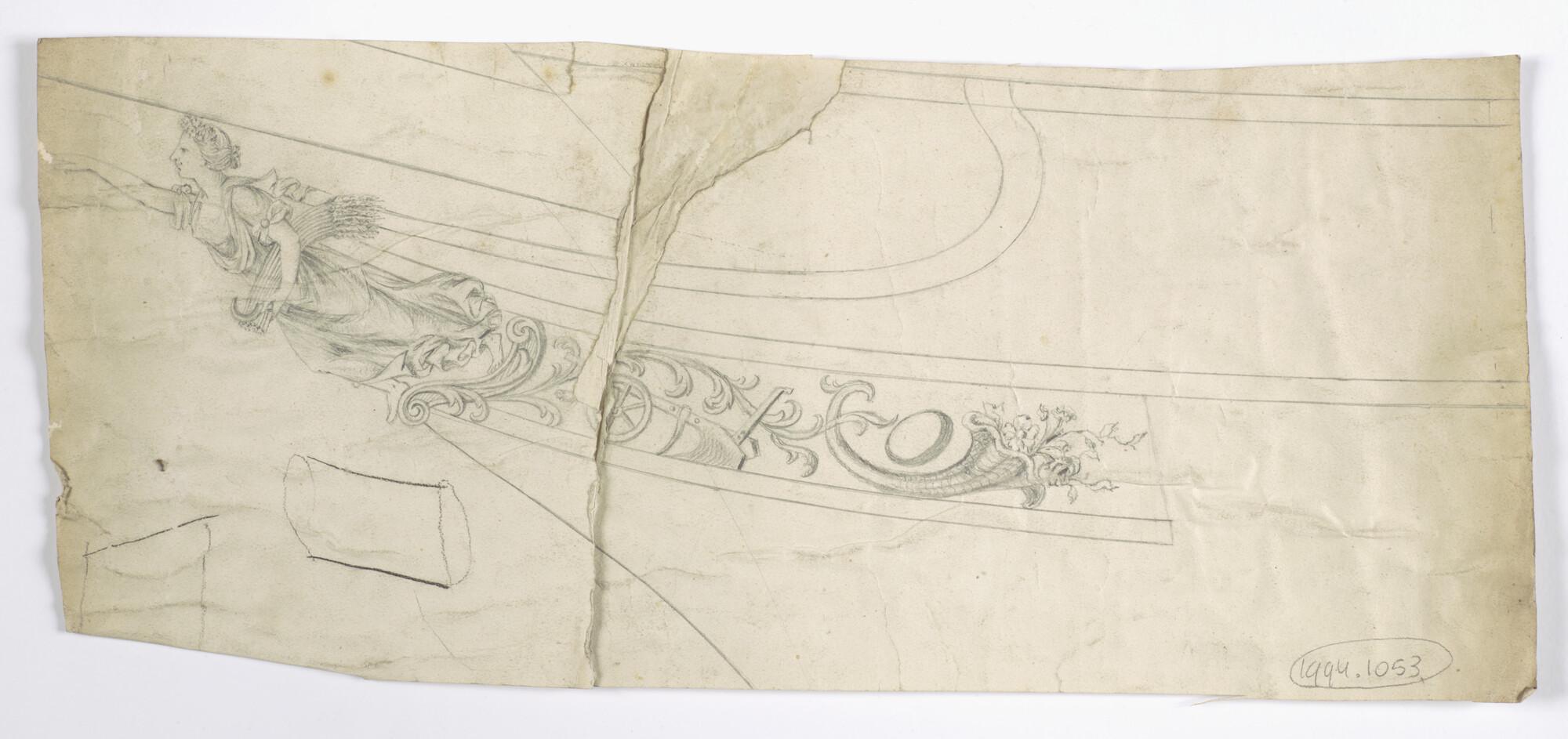 Schets van boegbeeld met vrouwfiguur en gestileerde ...