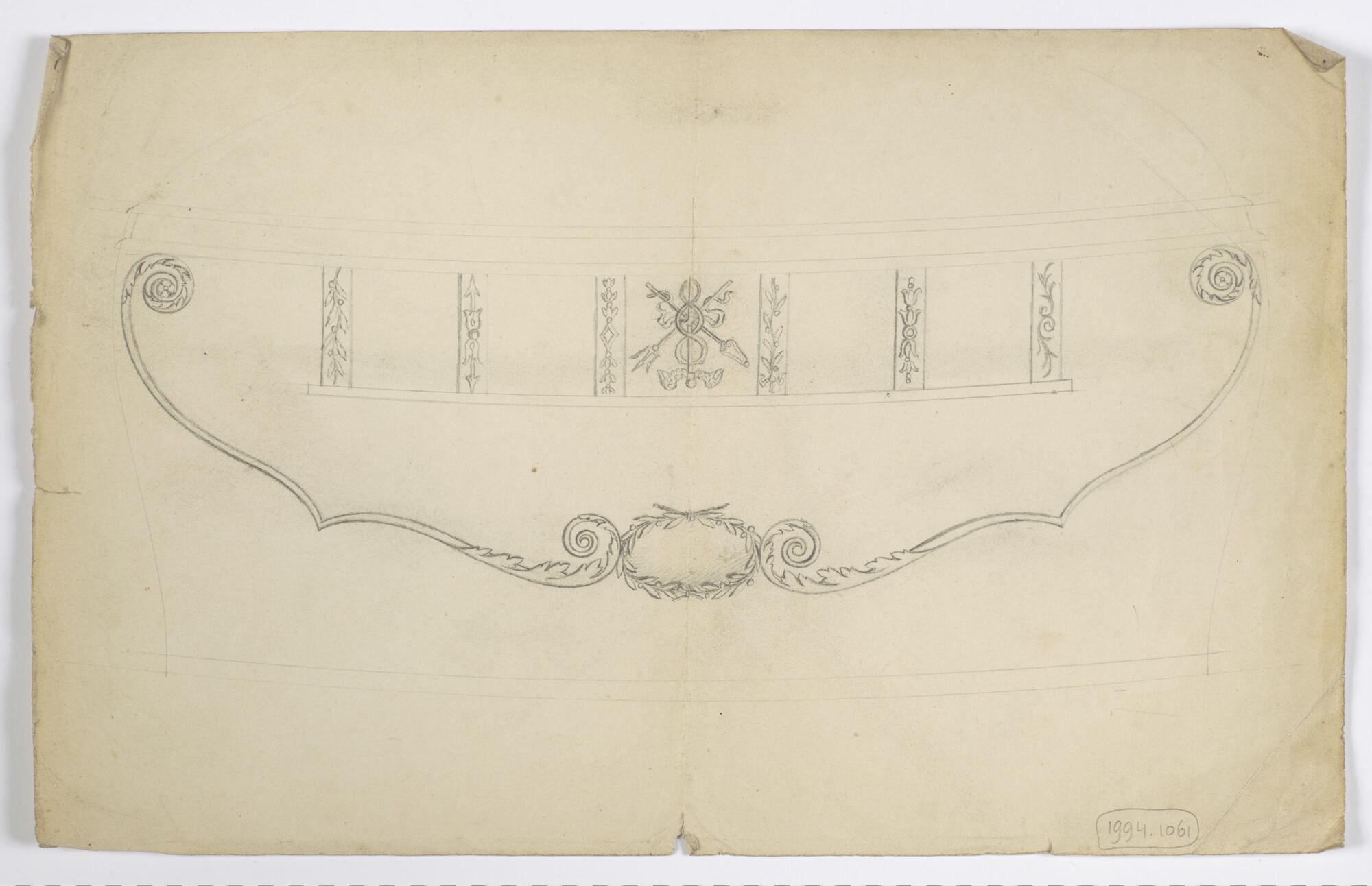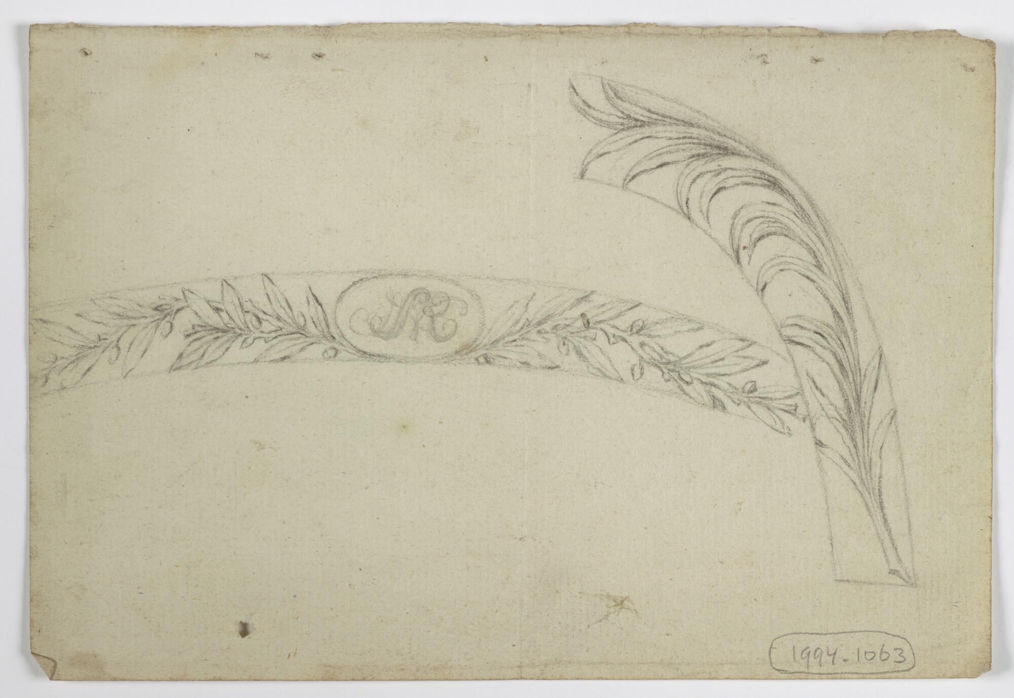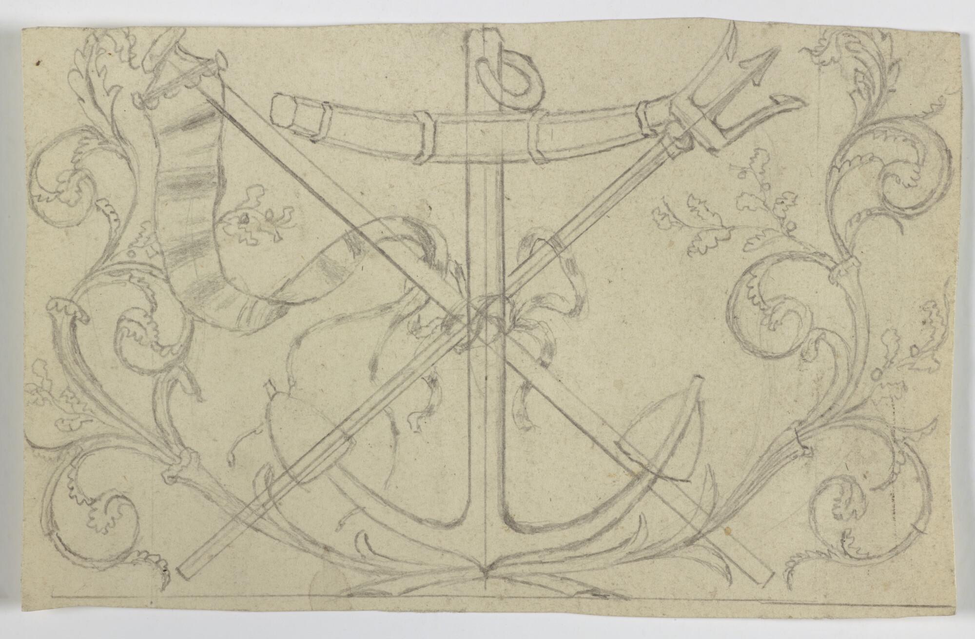 Tekening van spiegelversiering met anker, mercuriusstaf