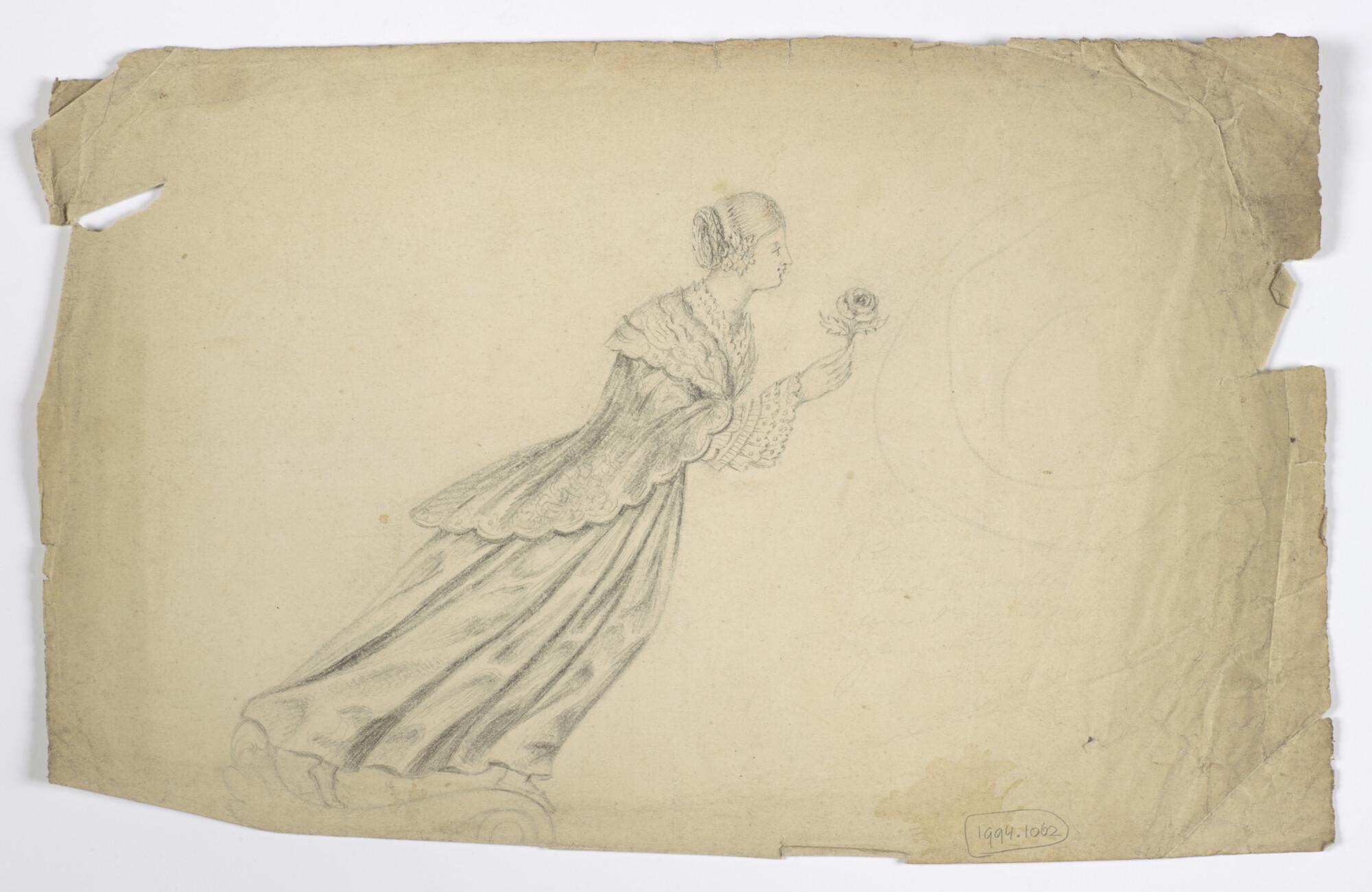 Tekening van een boegbeeld met vrouwenfiguur in lang...