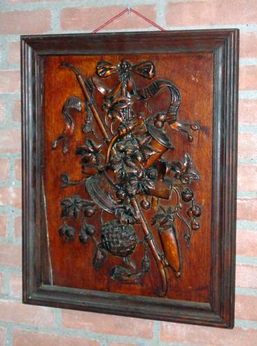 Reclame bord. Mahonie houten bord, reliëf gestoken.