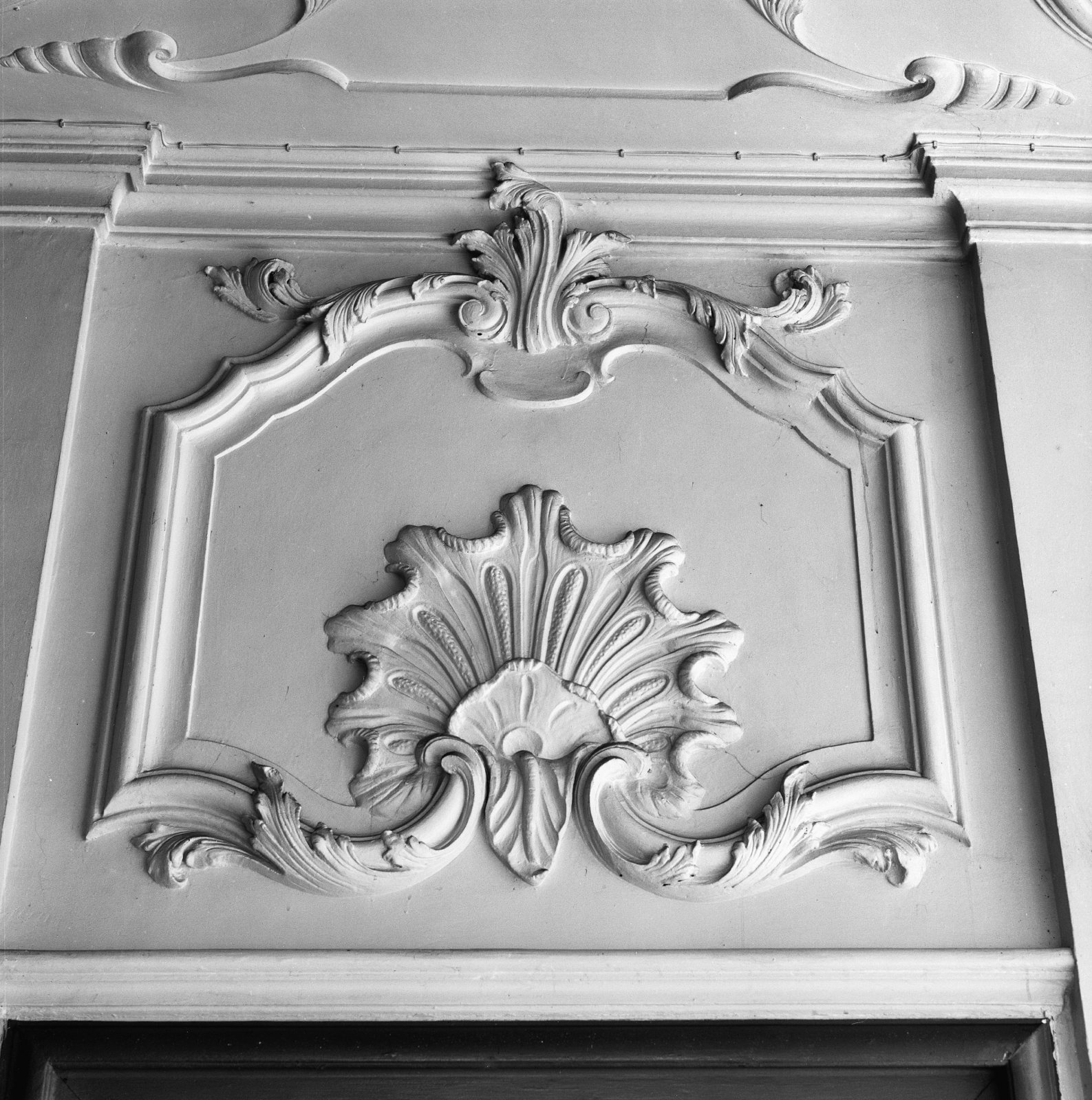 Interieur, detail van stucwerk gang: bovendeurstuk