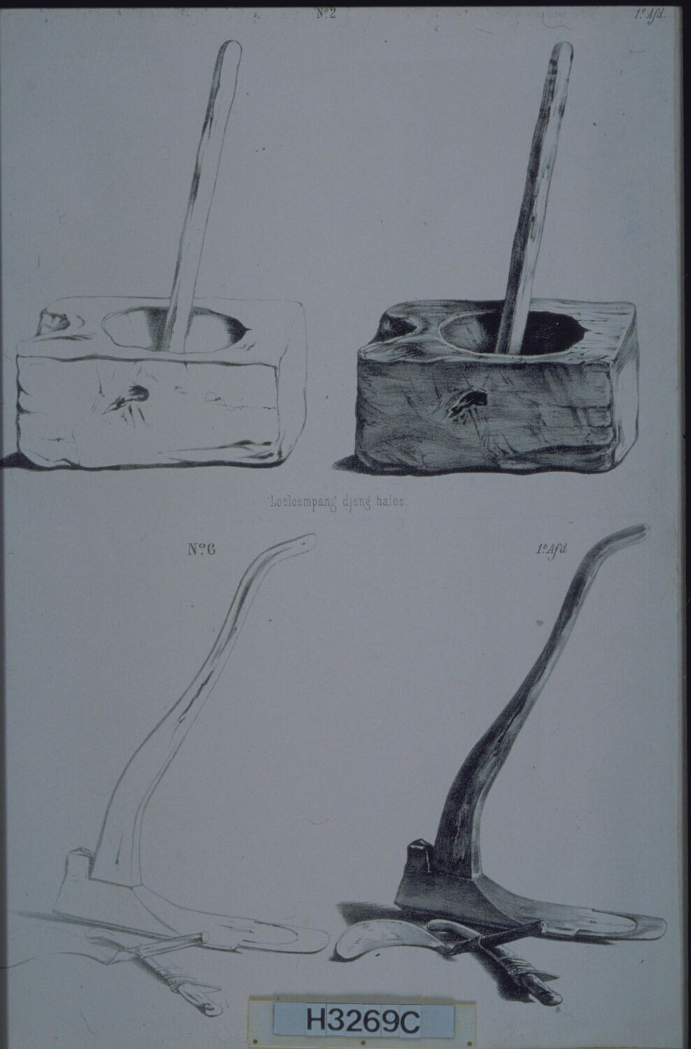 Een maalsteen (no 3) en een snijplank met mes (no 1)