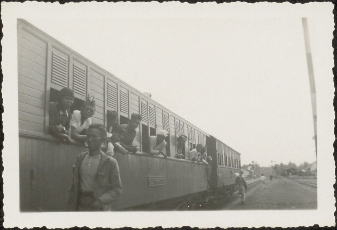 Treinpassagiers hangen uit het raam van een wagon