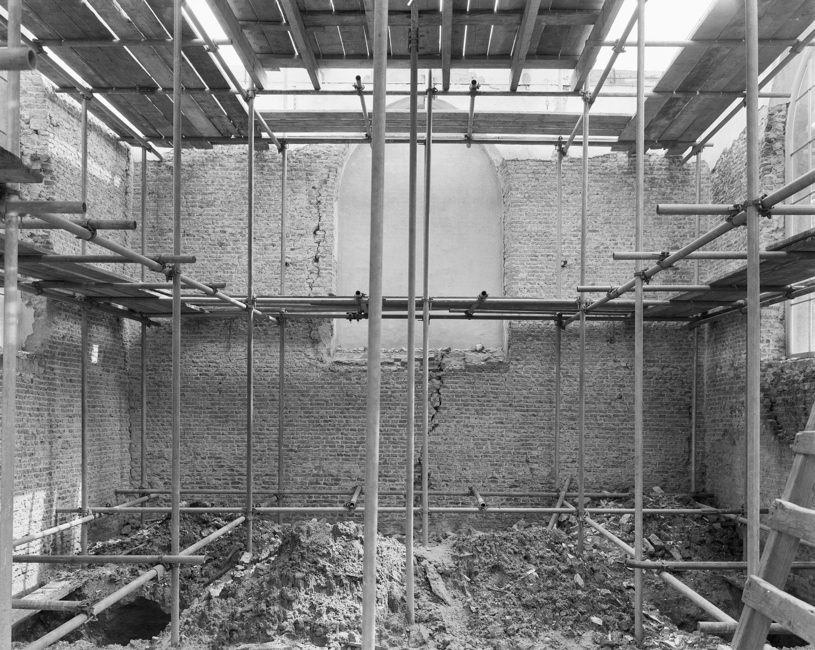 Interieur oostgevel schip in de steigers tijdens res...