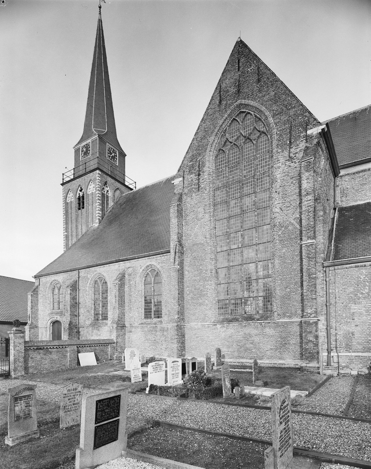 Zicht op de zuidwestgevel met kerktoren