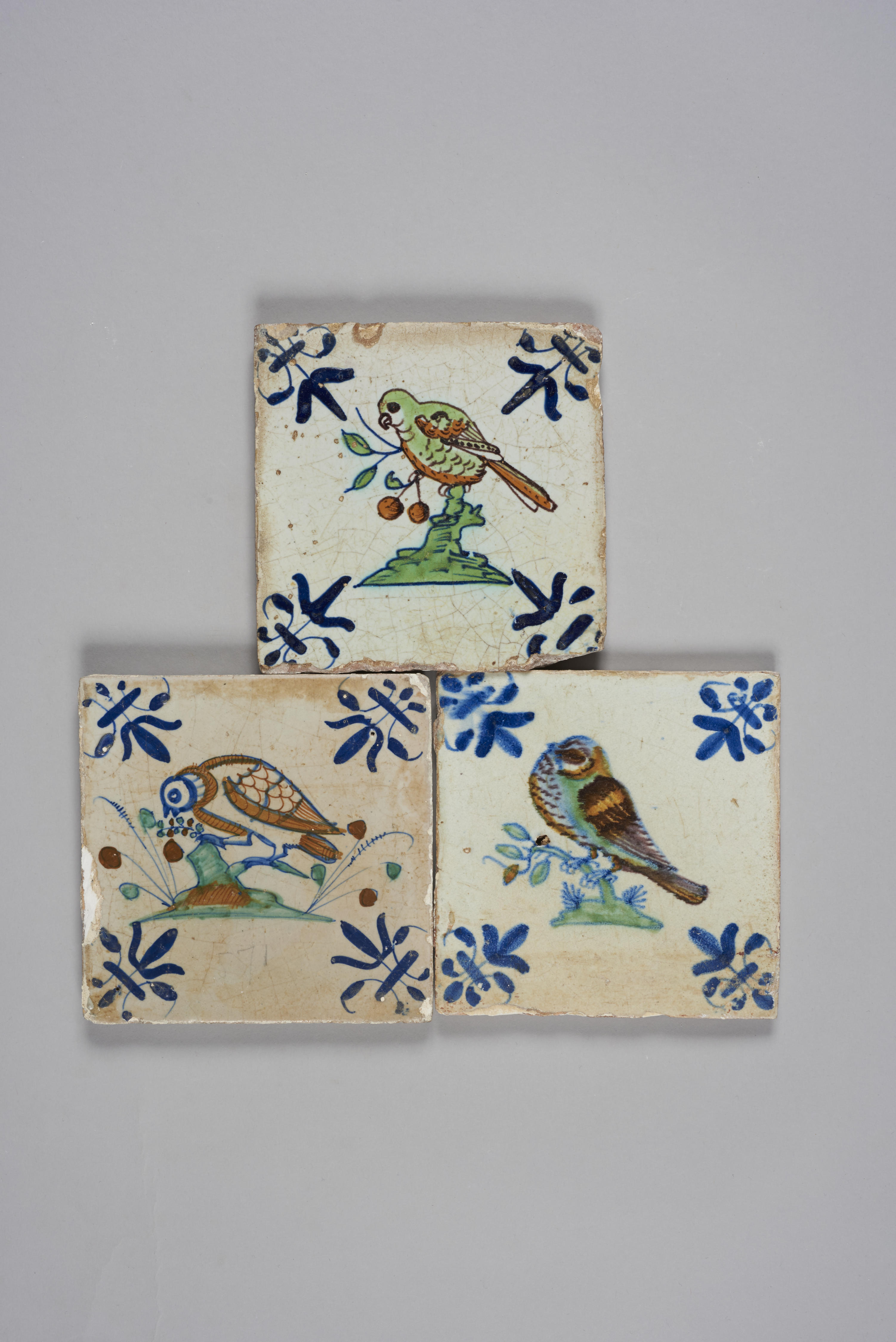 Drie wandtegels met afbeelding vogel, 1620–1640