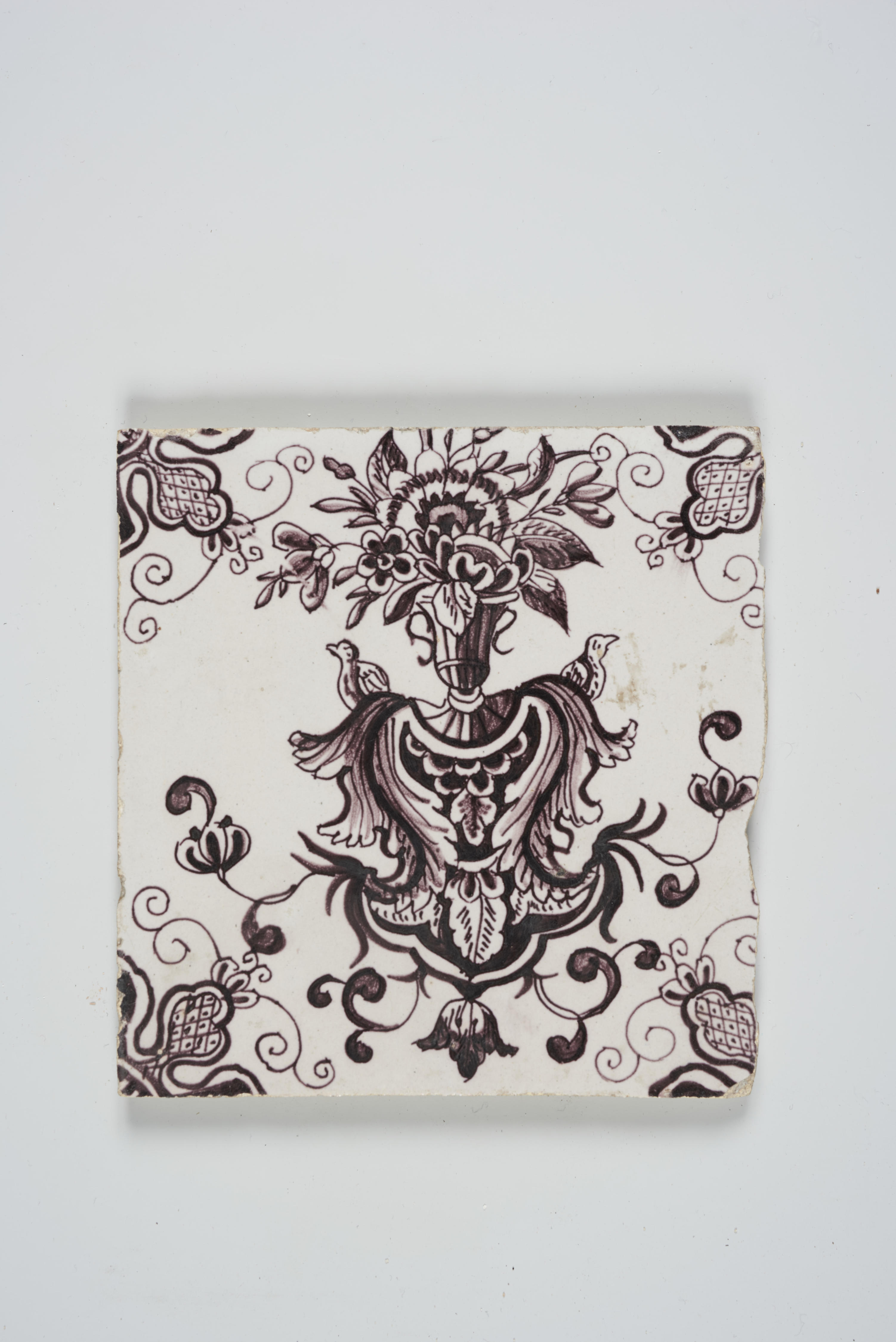 Wandtegel met cartouchedecor (bloempot op cartouche)...