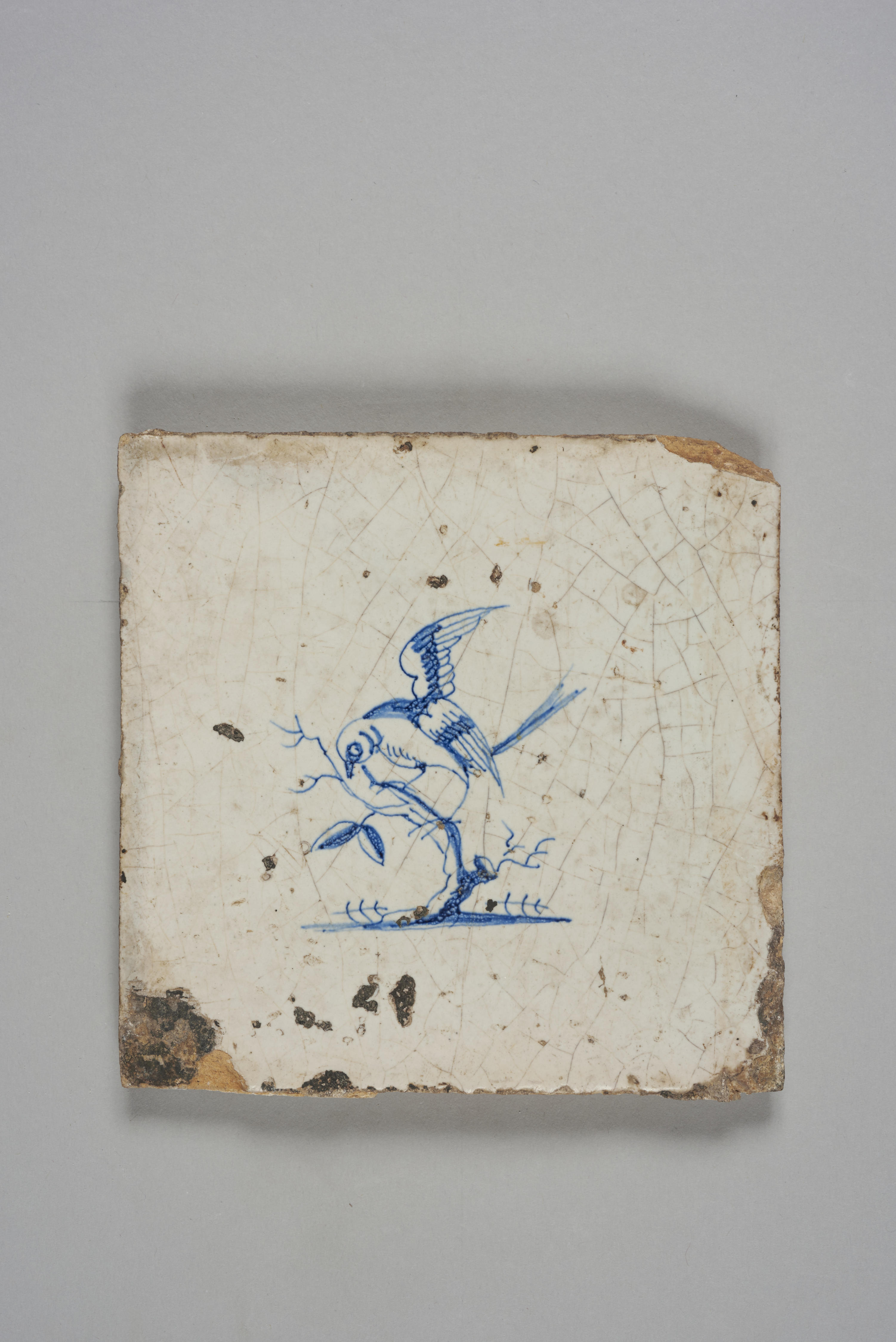 Wandtegel met afbeelding vogel op takje, 1625–1675
