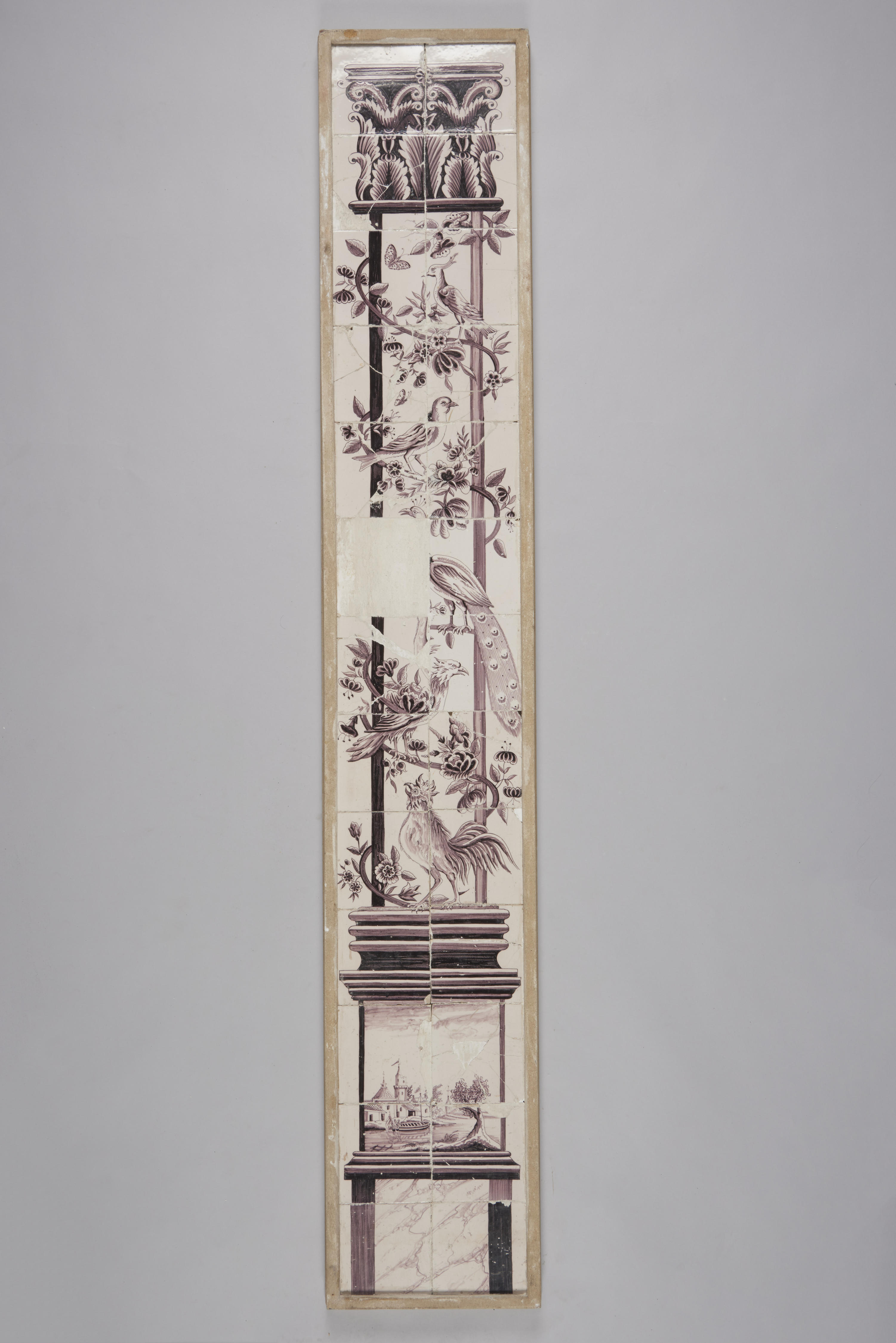 Tegeltableau van een dubbele pilaar met bloemen, vog...
