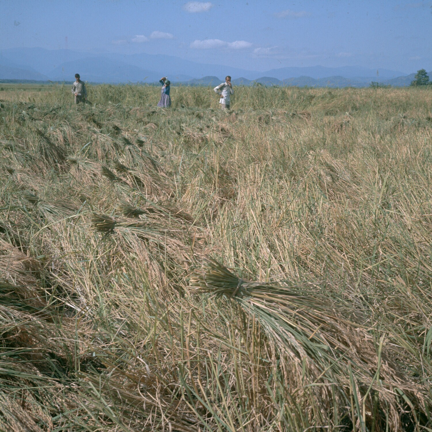 Rijstveld met geoogste en gebonden schoven in Noord ...