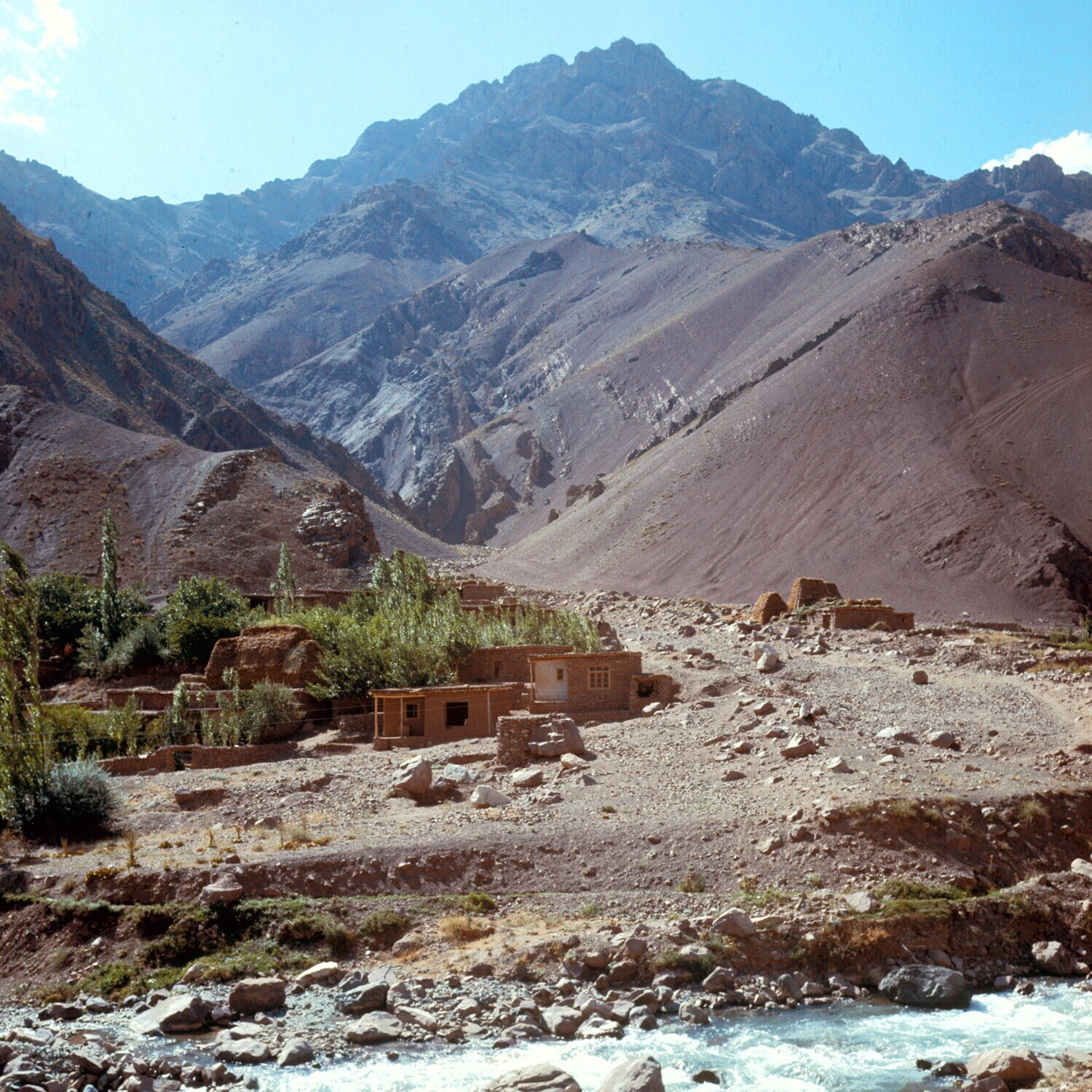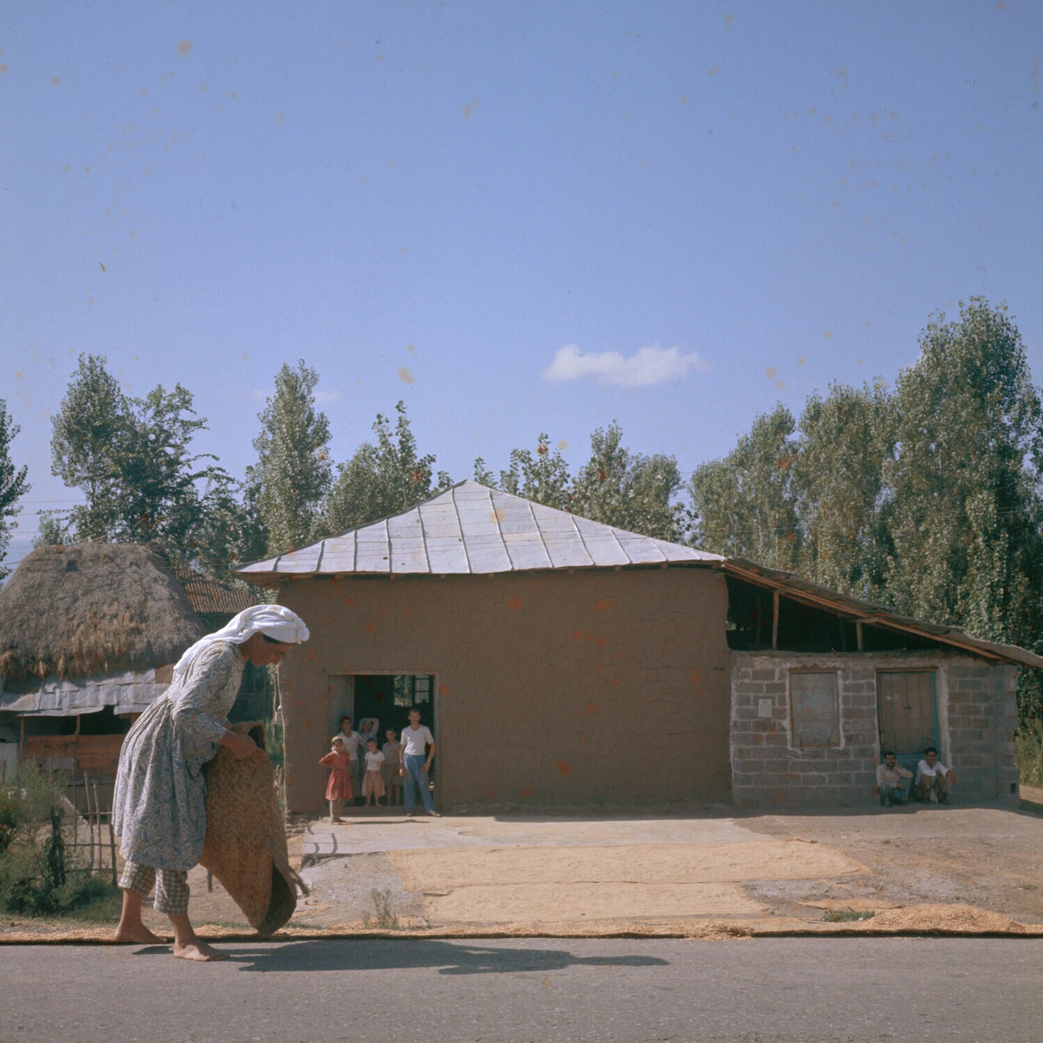 Boerenhuizen in N.Iran, kinderen (met vader) op de v...