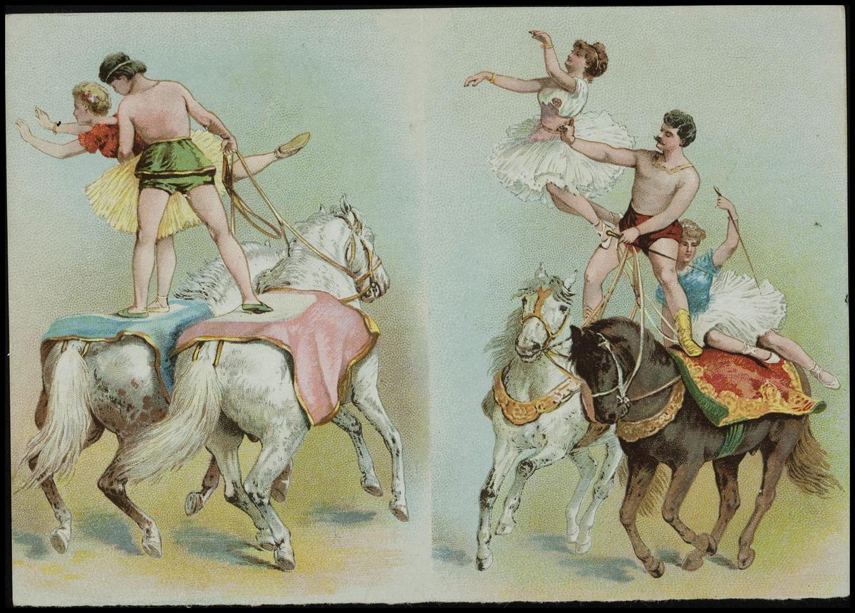 Twee afbeeldingen van acrobatiek te paard