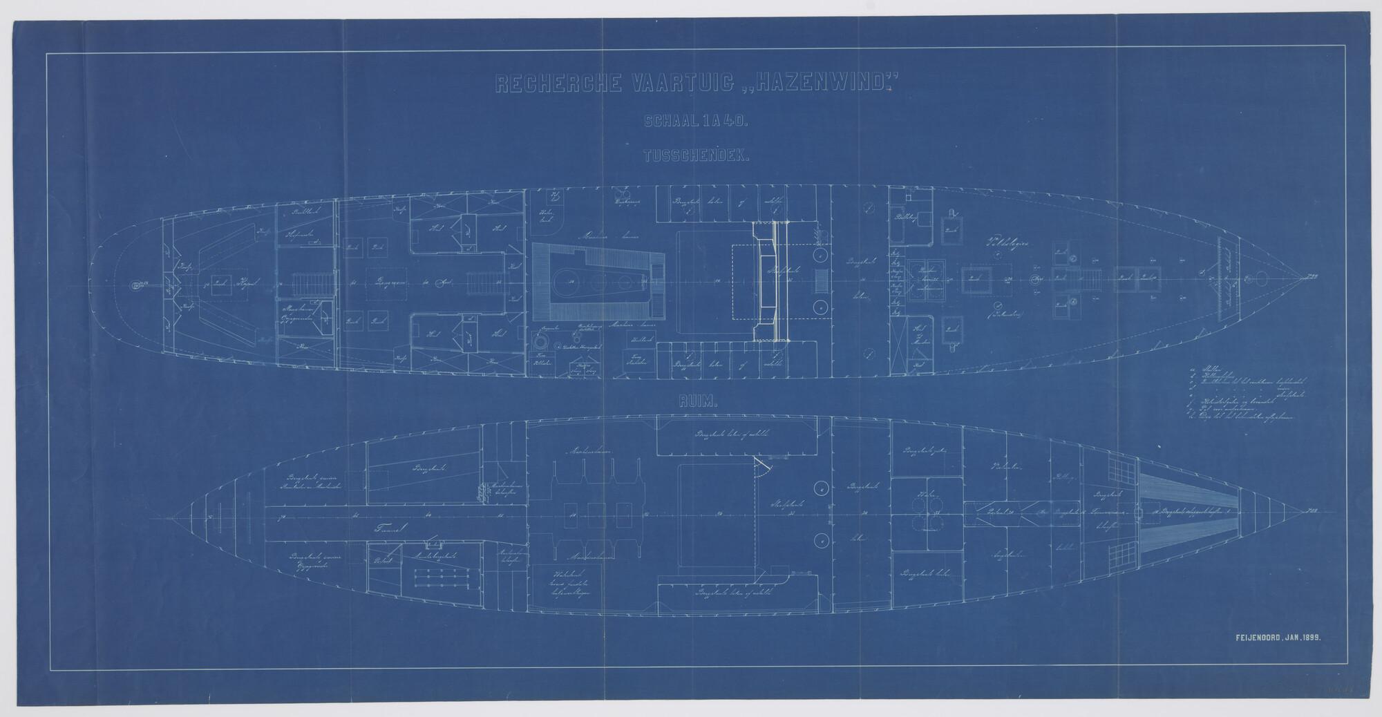 Langsscheepse doorsnede en indelingstekening van tus...