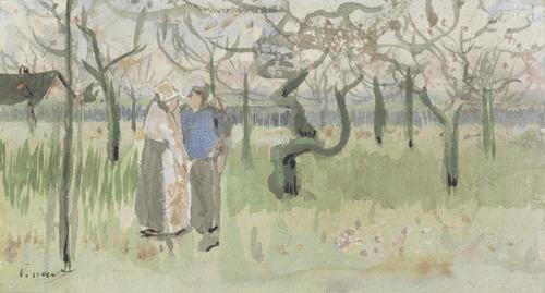Bloeiende boomgaard met paartje: lente