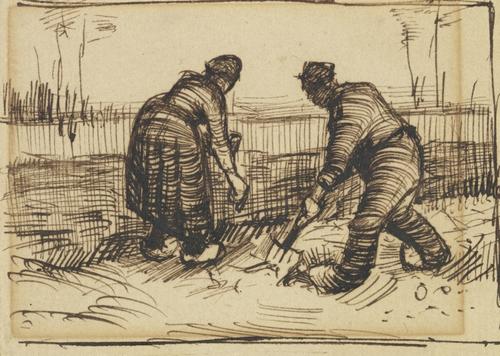 Schets van Man en vrouw die aardappelen planten