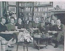 Groep heren voor een gebouw.
