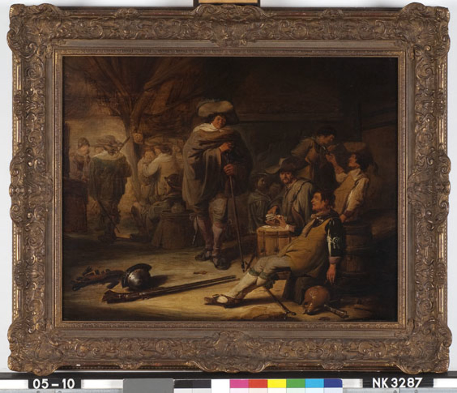 Interieur met drinkende soldaten bij kaartspel