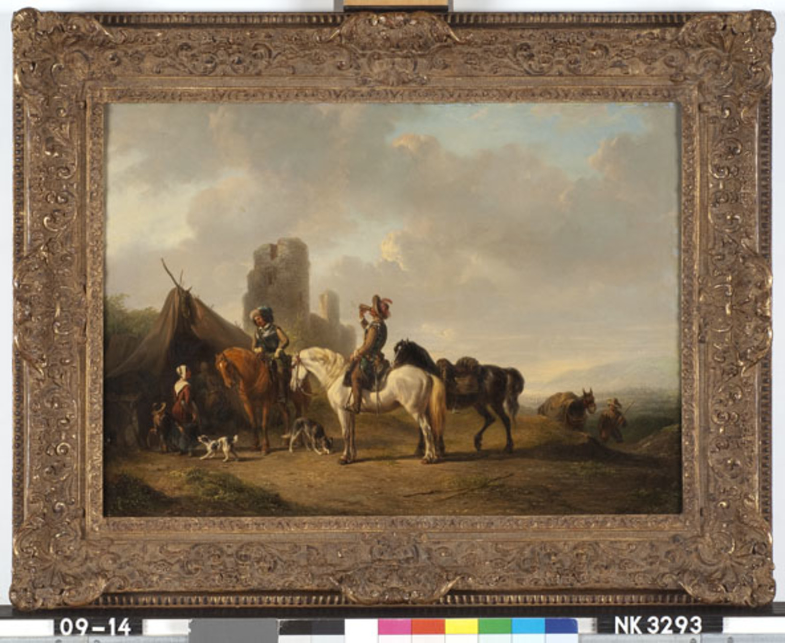 Heuvelig landschap met twee cavaleristen bij een ten...