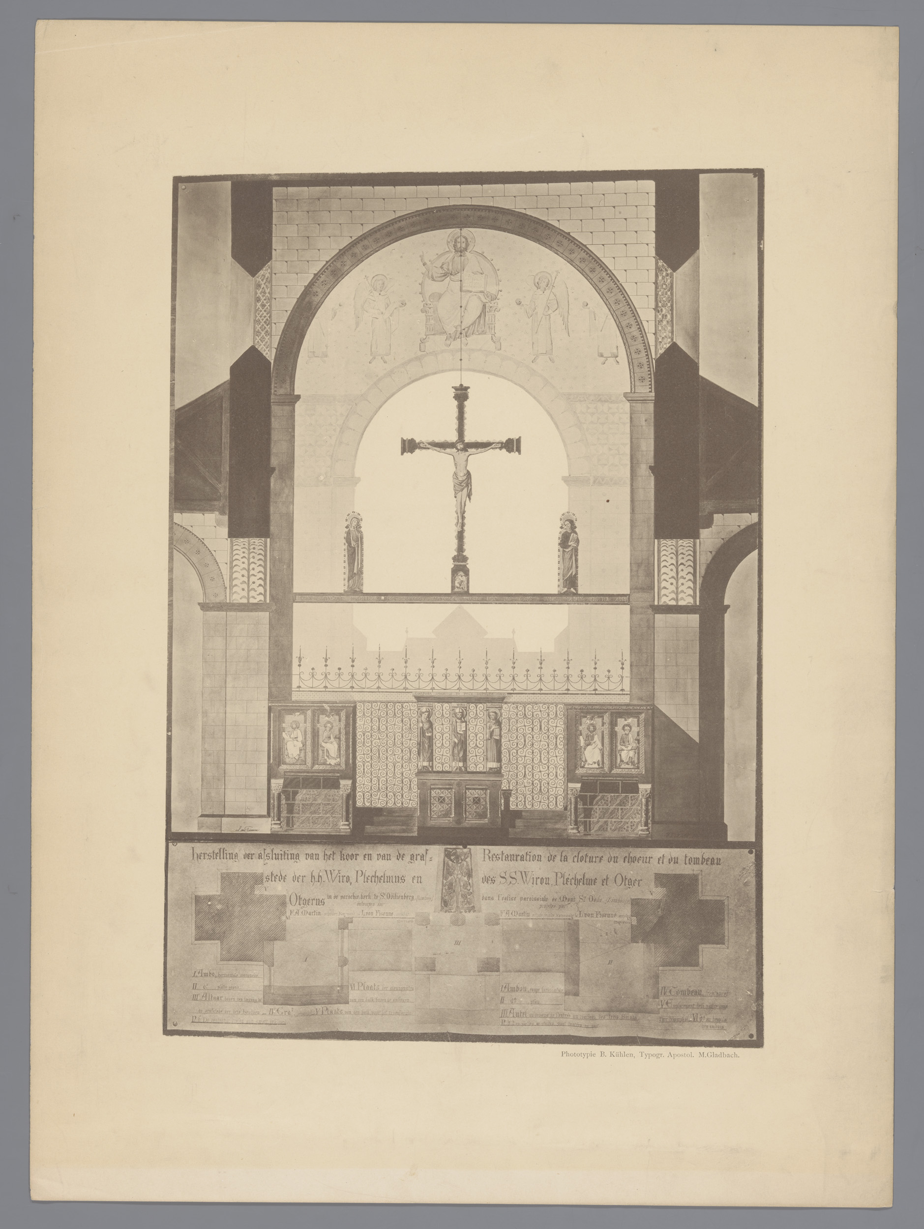 Reproductie van een tekening met het koor van de Bas...