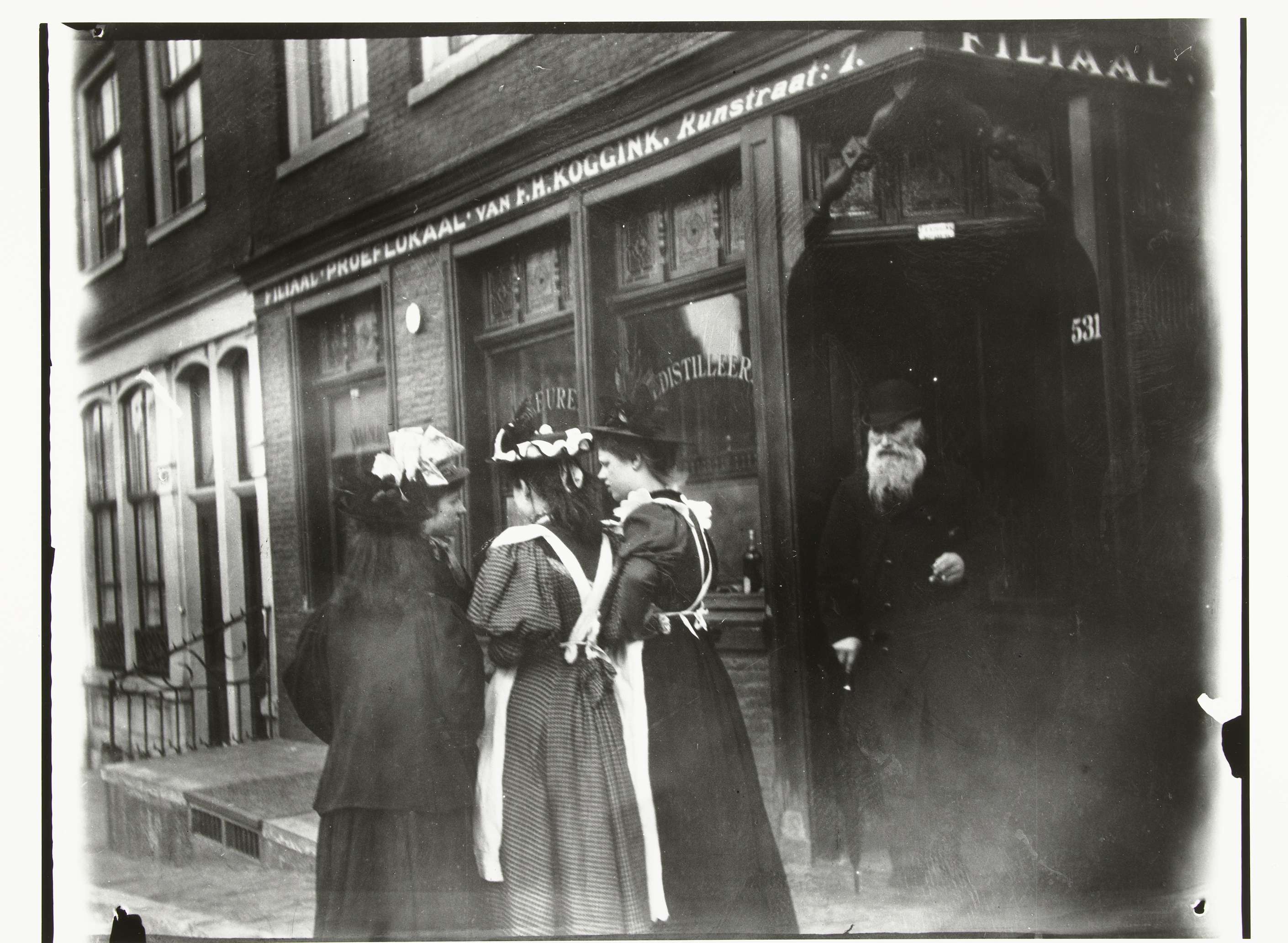 Vier jonge vrouwen op straat voor proeflokaal Koggin...