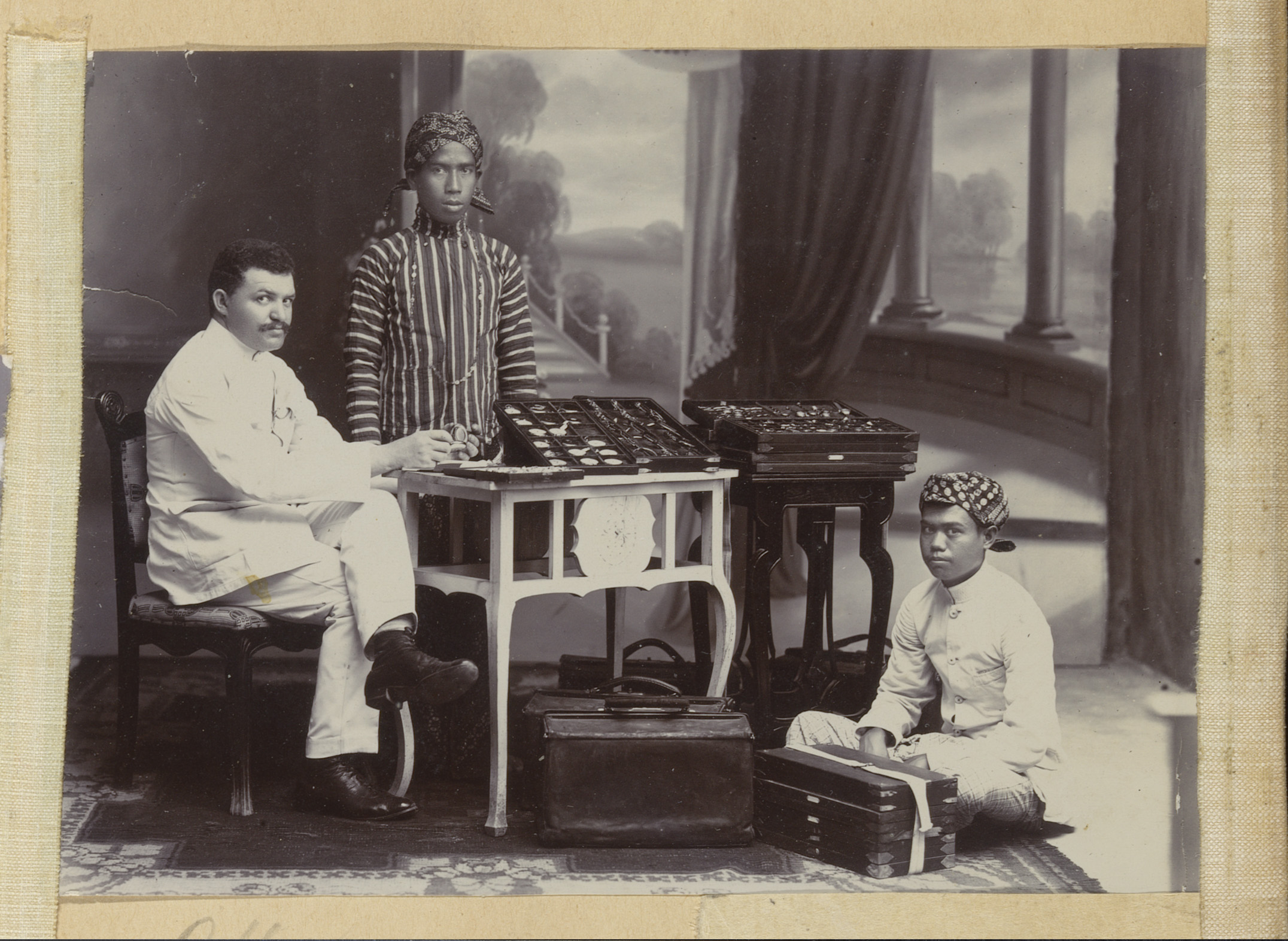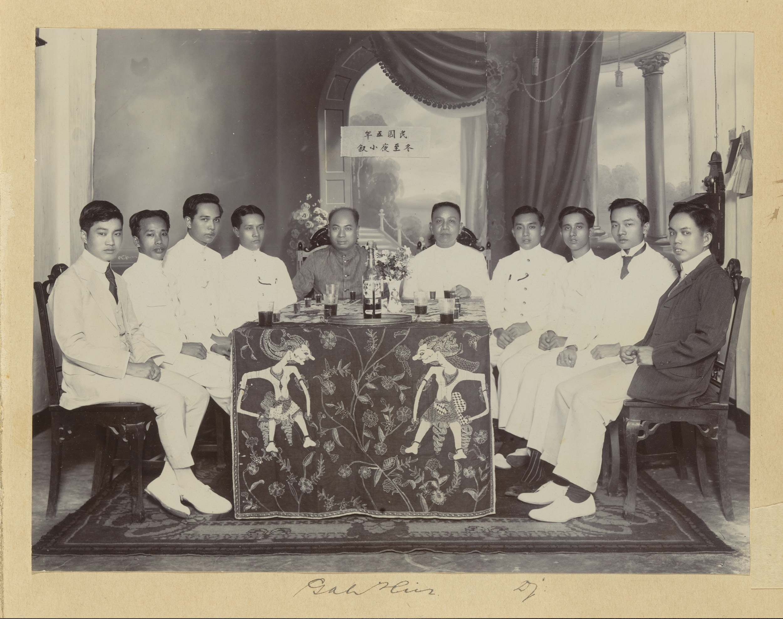 Groep Chinees-Indische mannen rondom een tafel, verm...