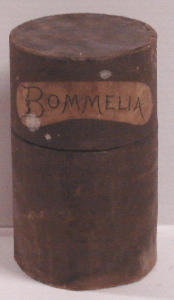 koker. Met textiel bekleed en deksel. Voorkant papie...