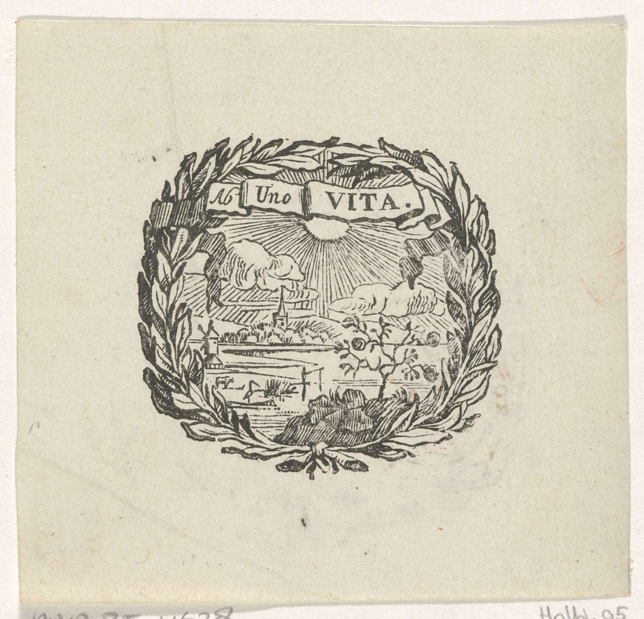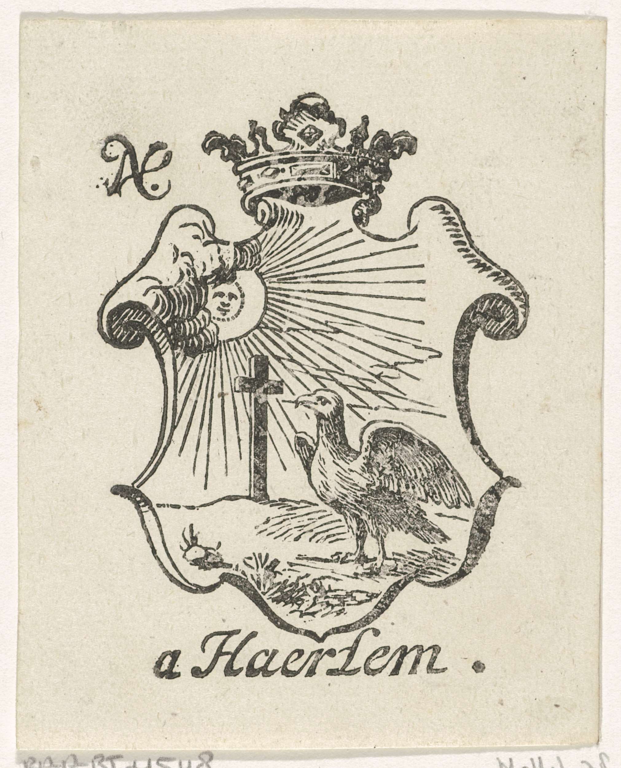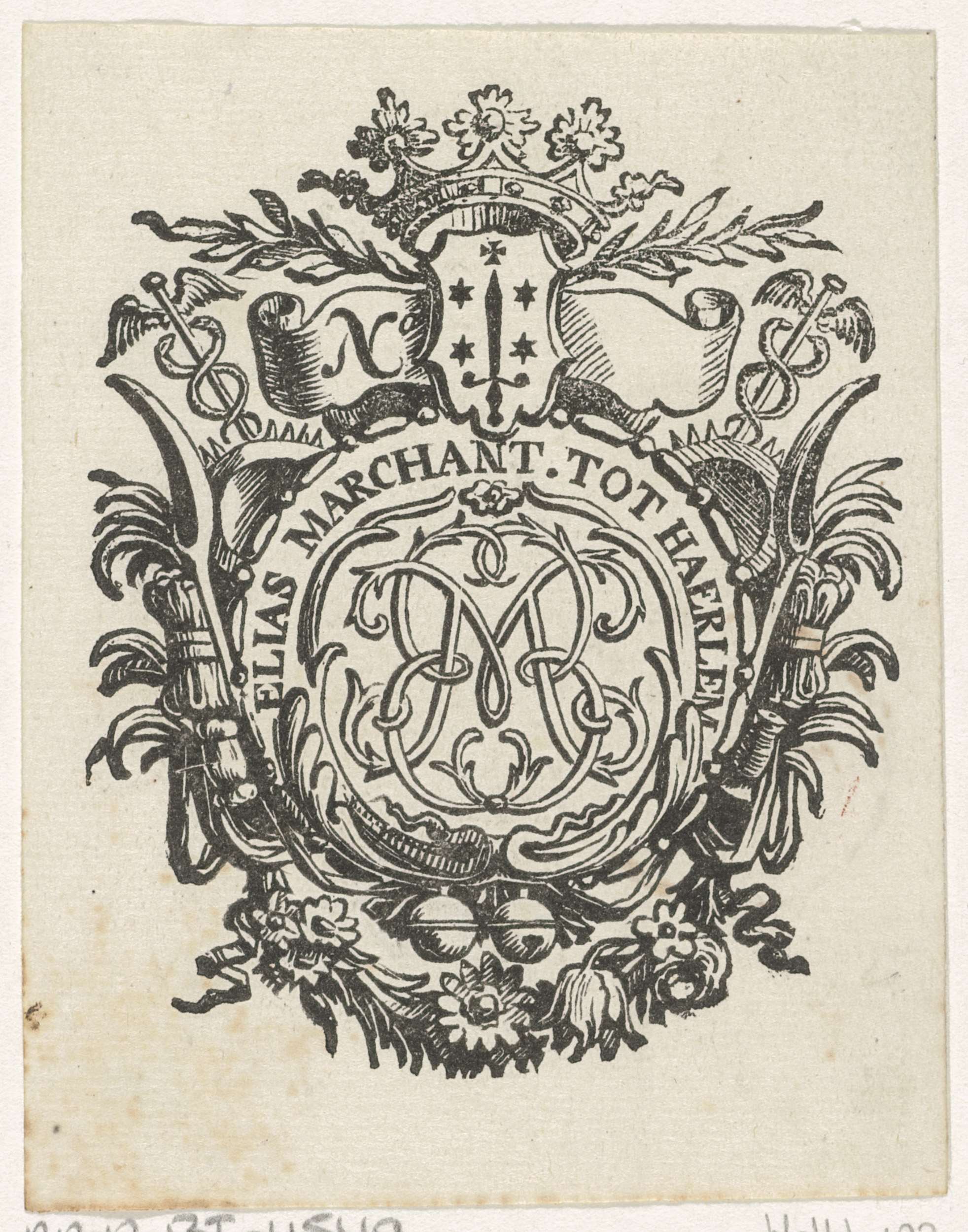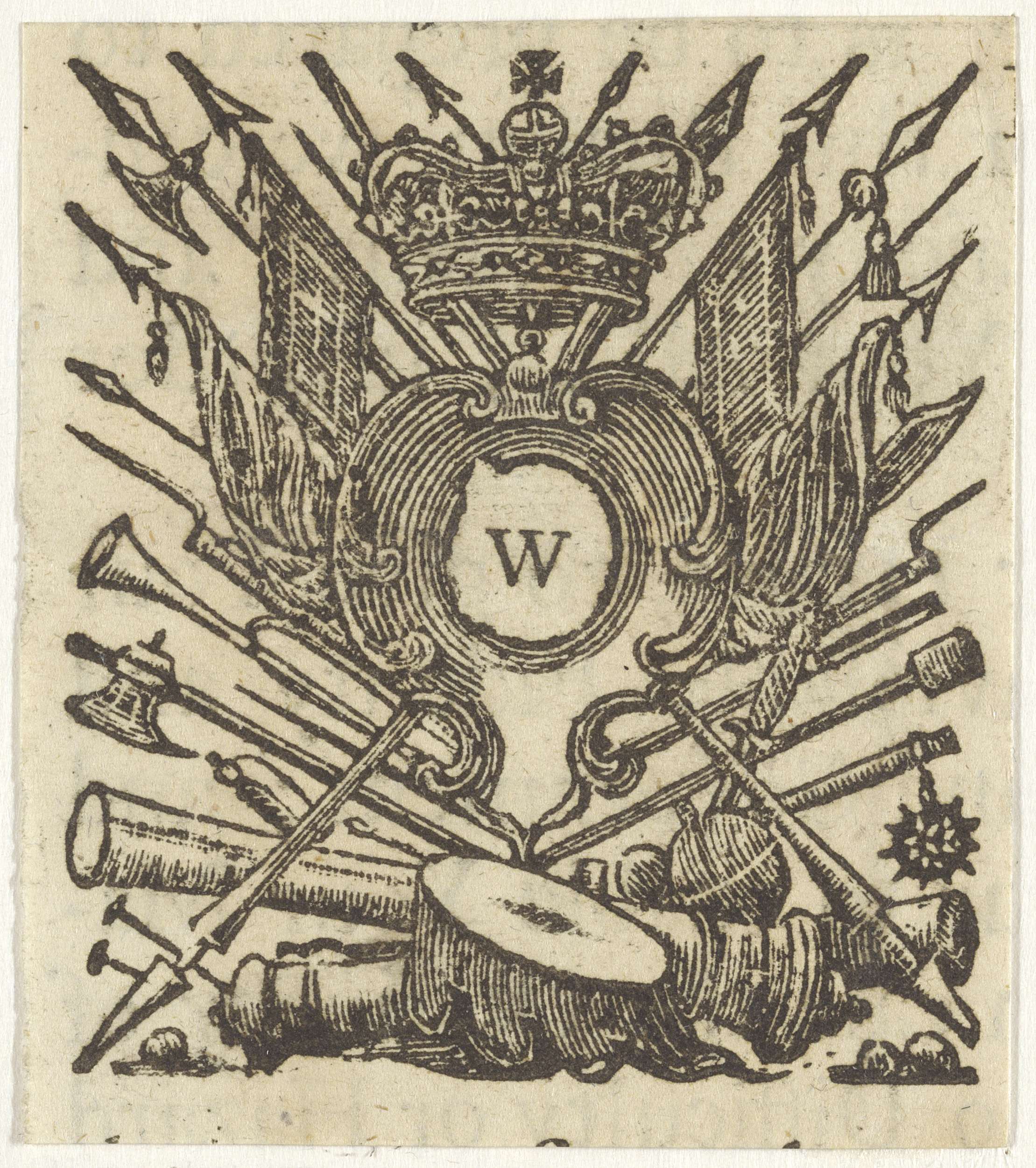 Vignet met een wapenschild, een kroon, wapentuig en ...