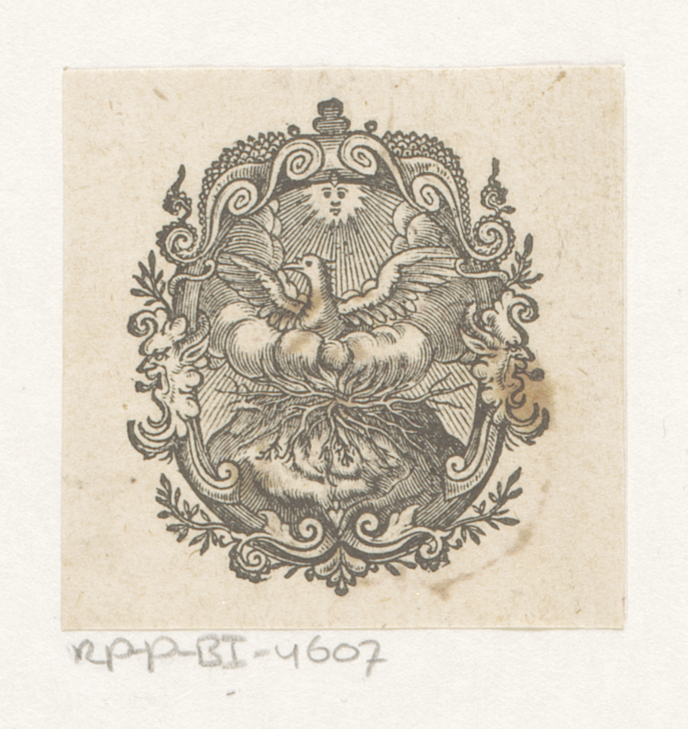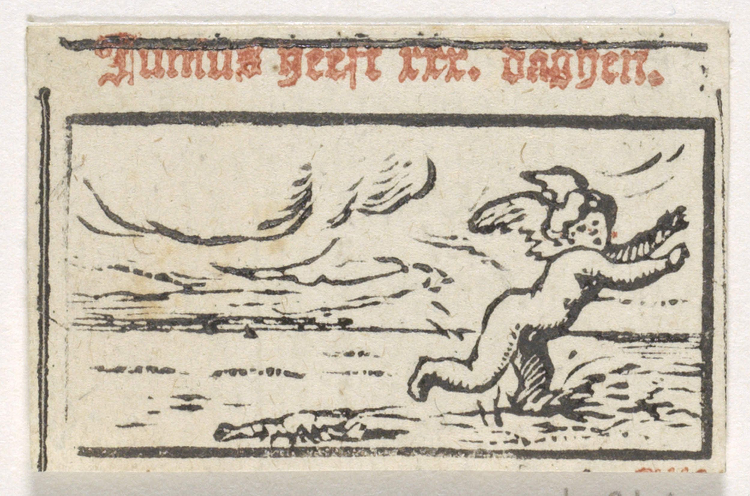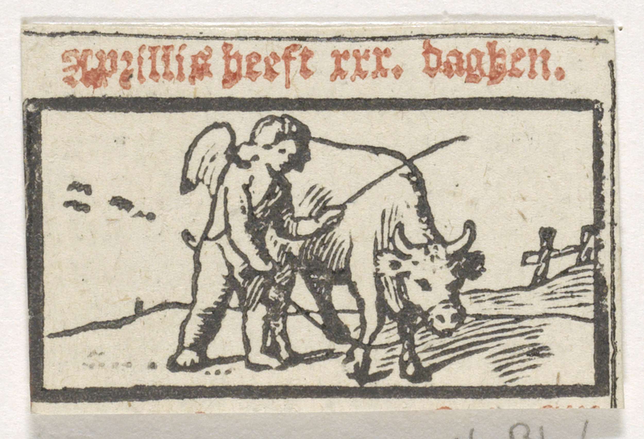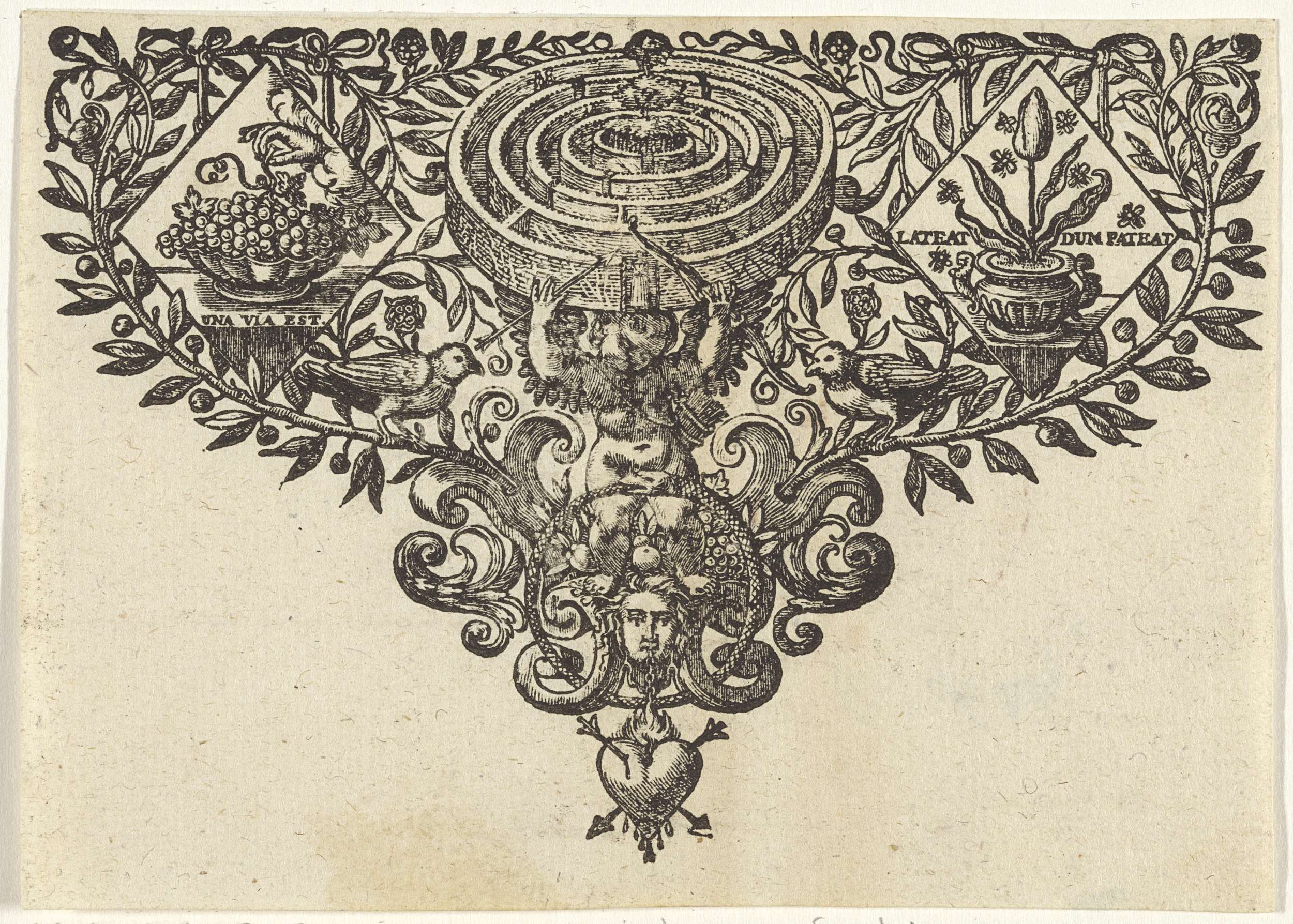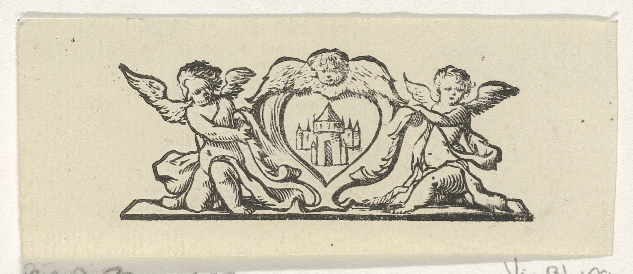 Vignet met een hartvorm en een kasteel, twee putti e...