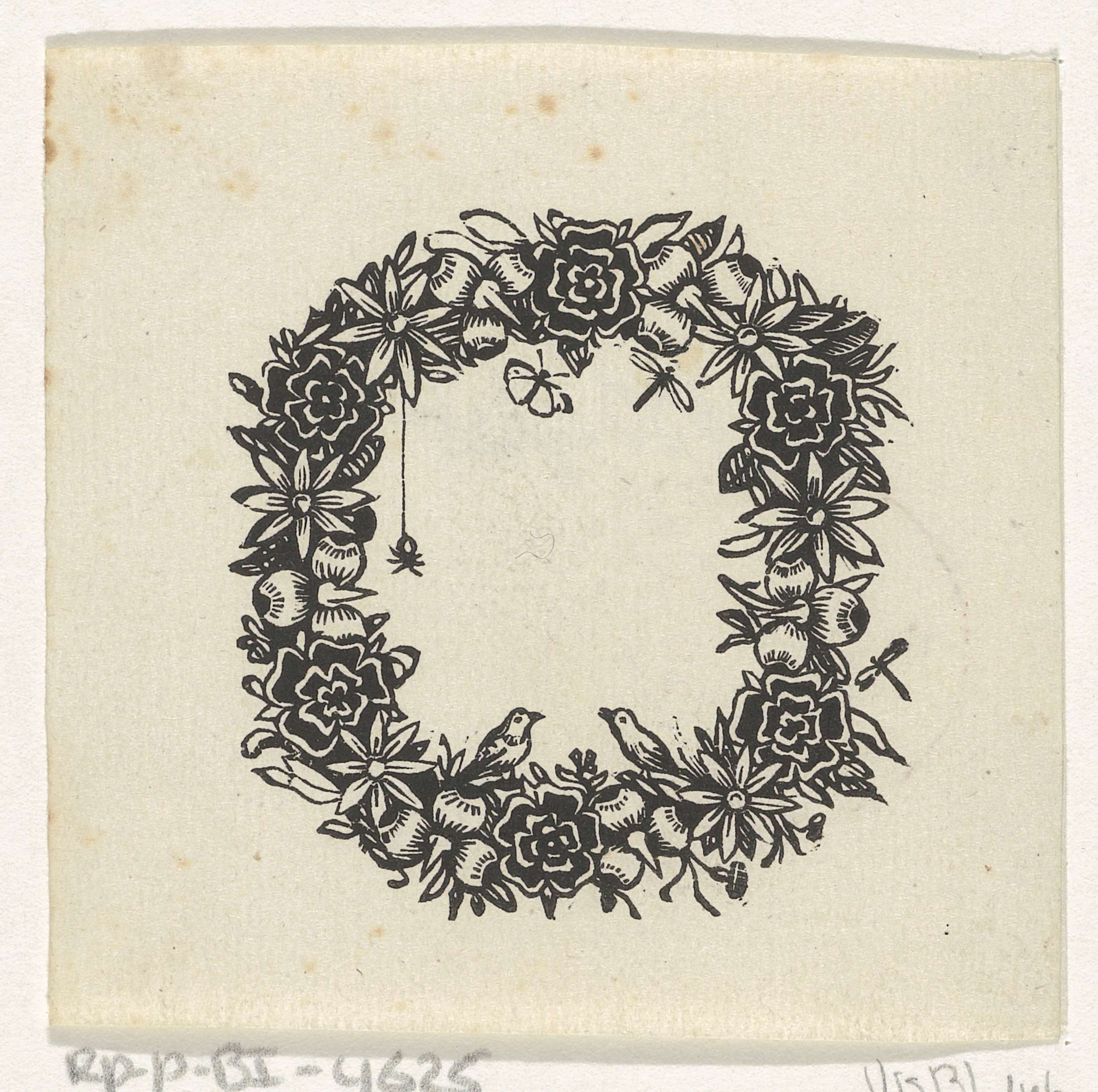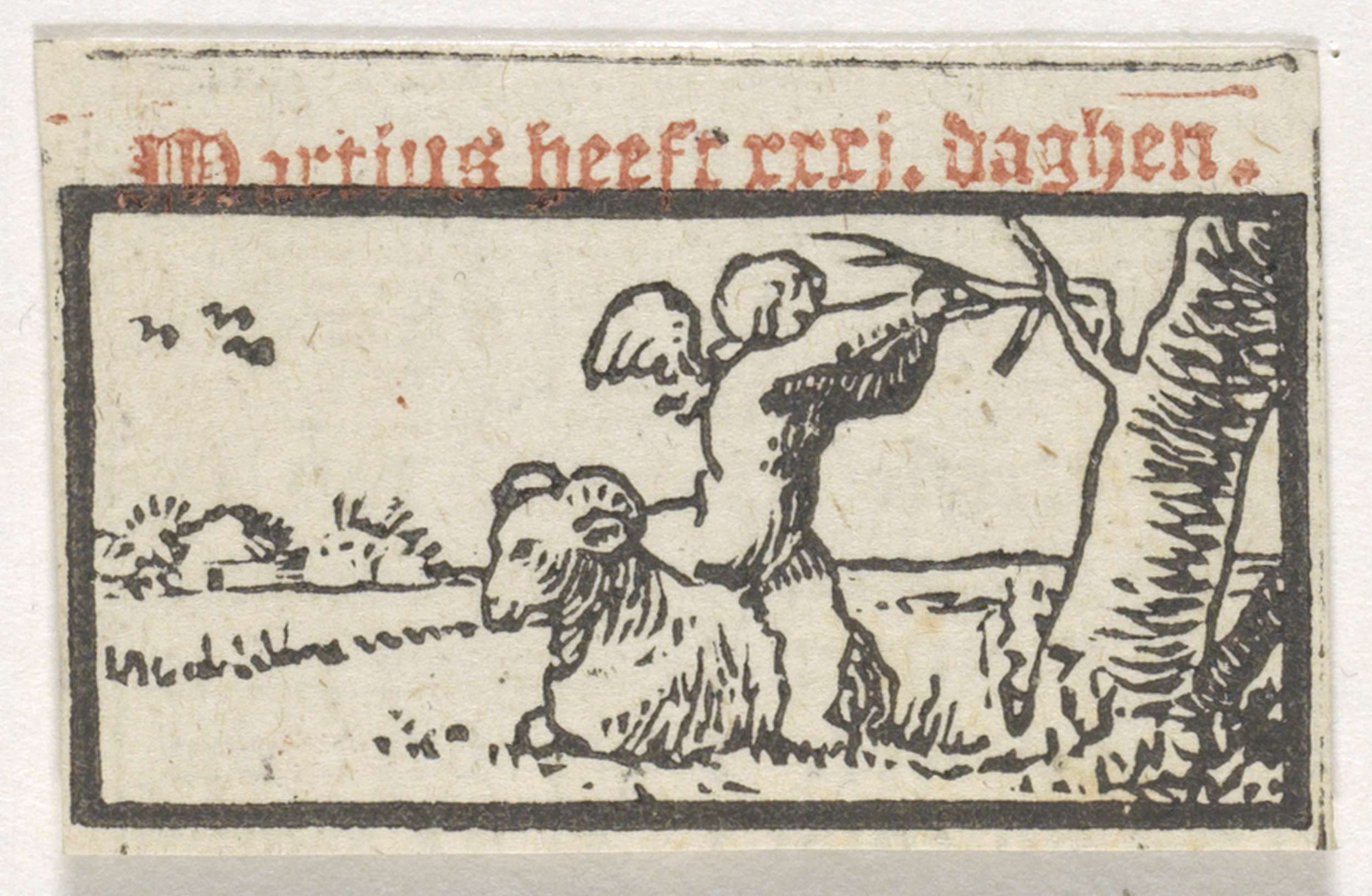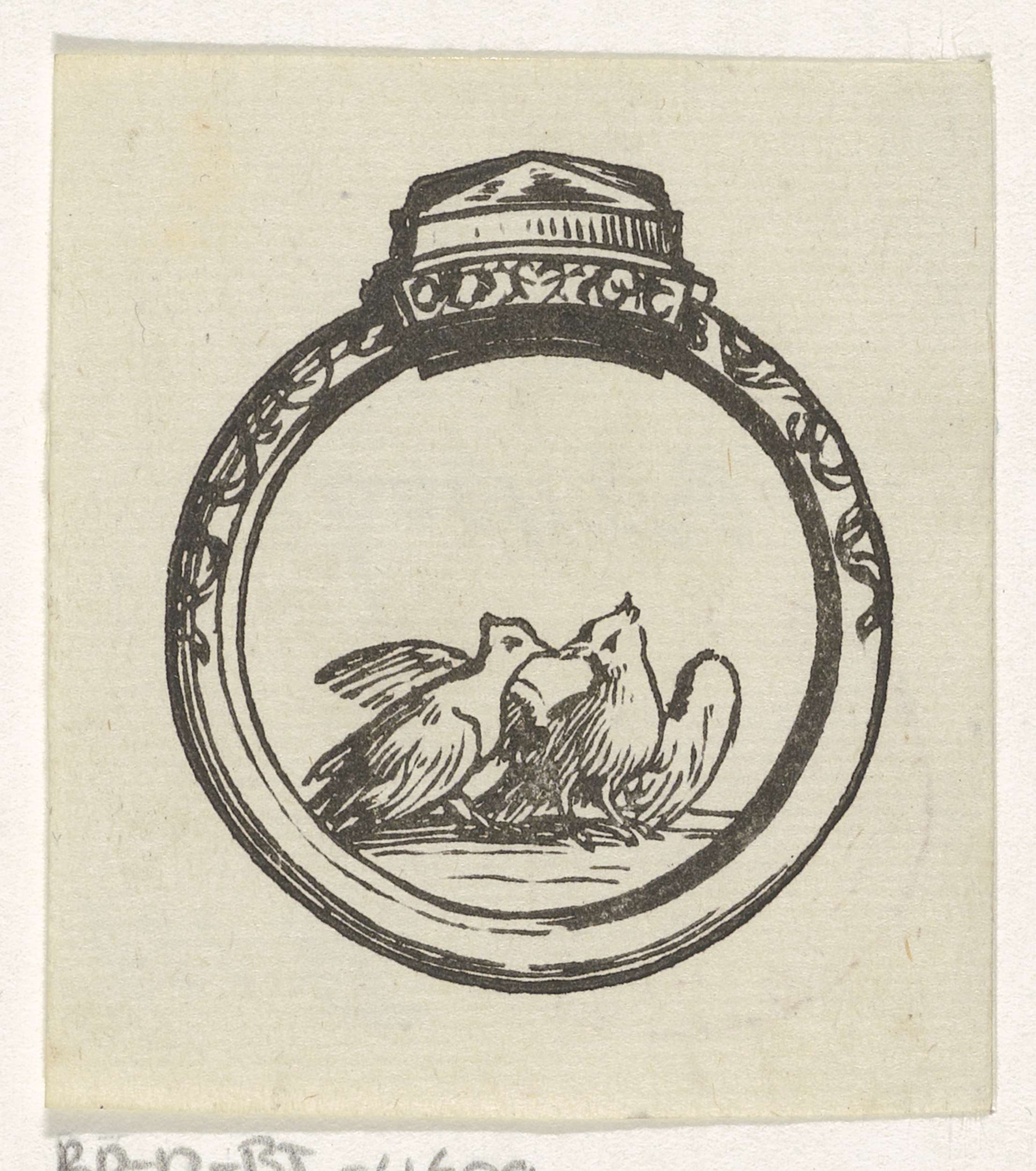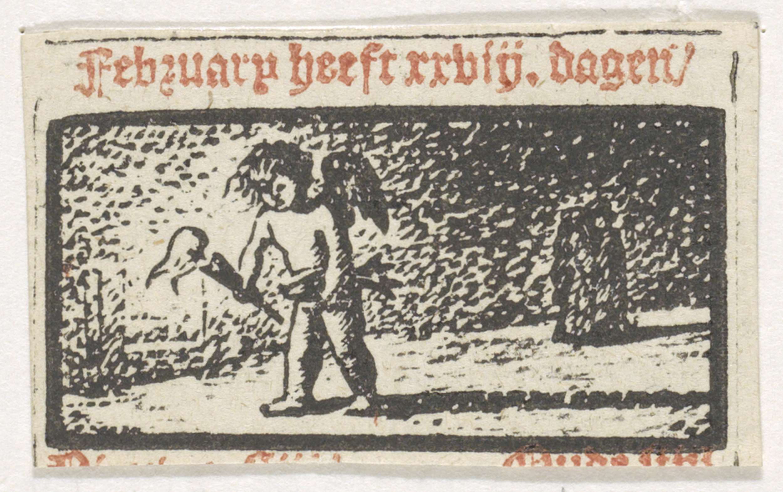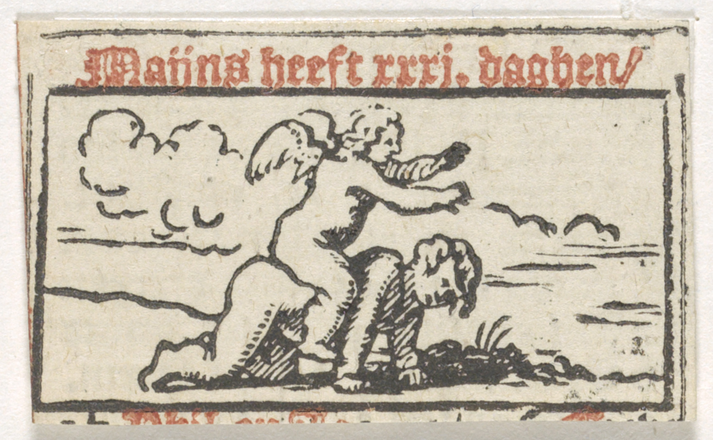 Vignet met een hartvorm en een kasteel, twee putti e...