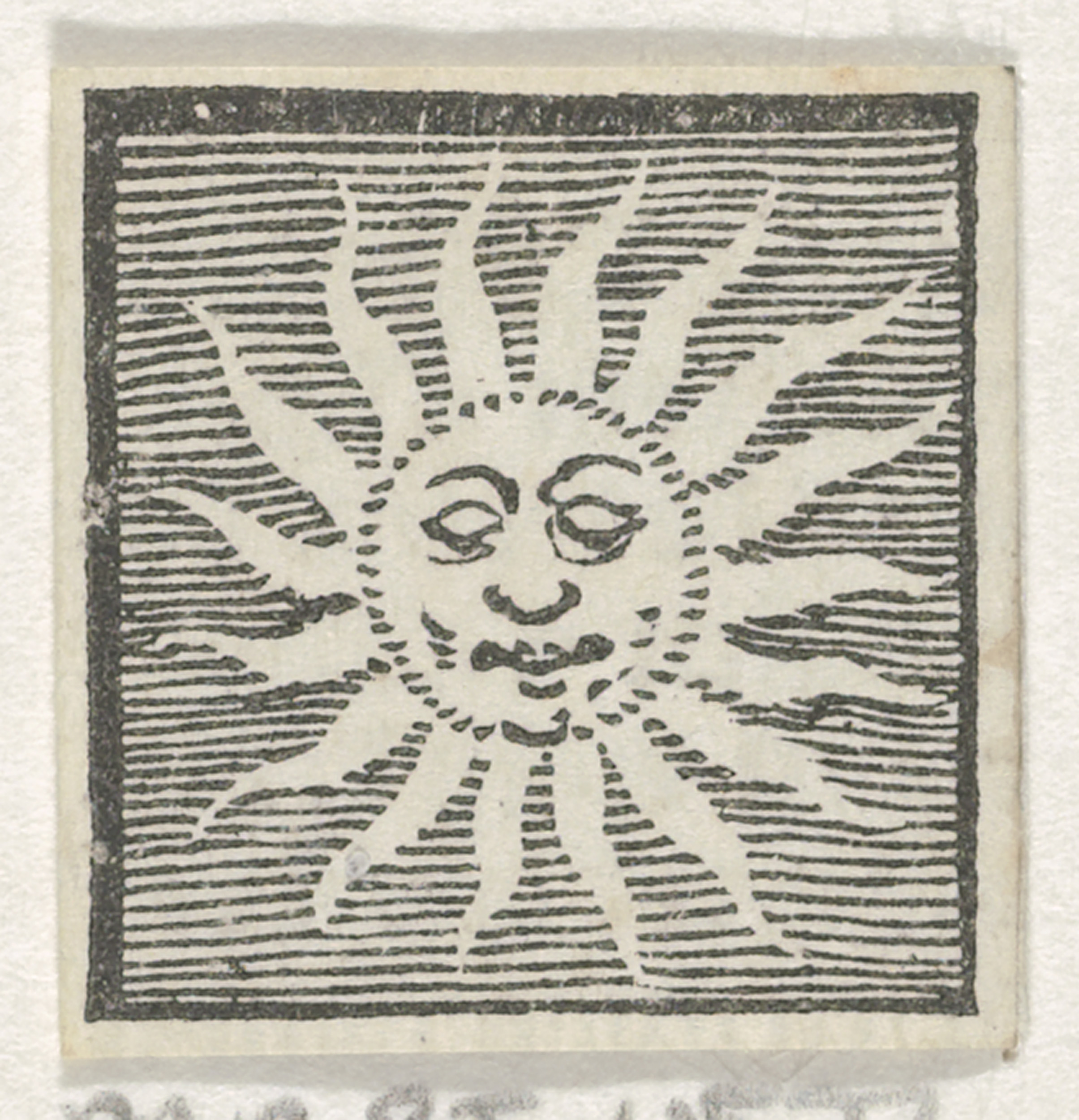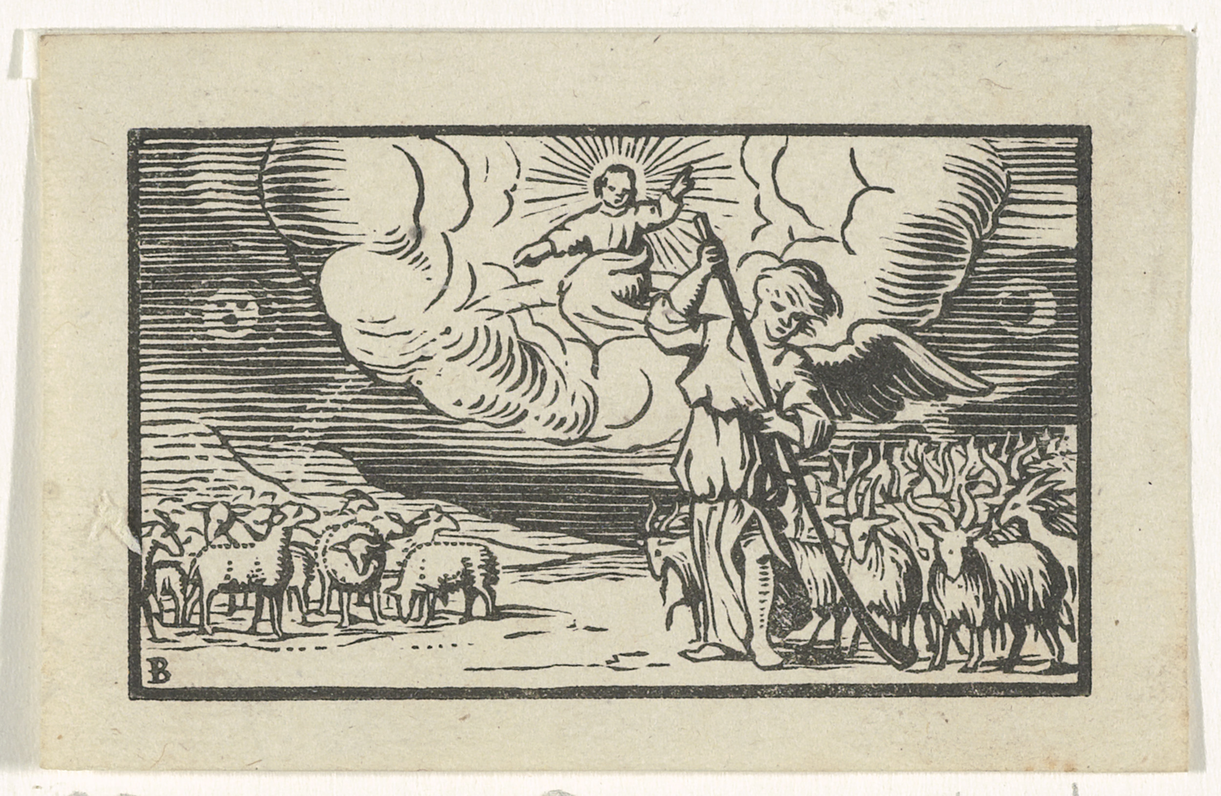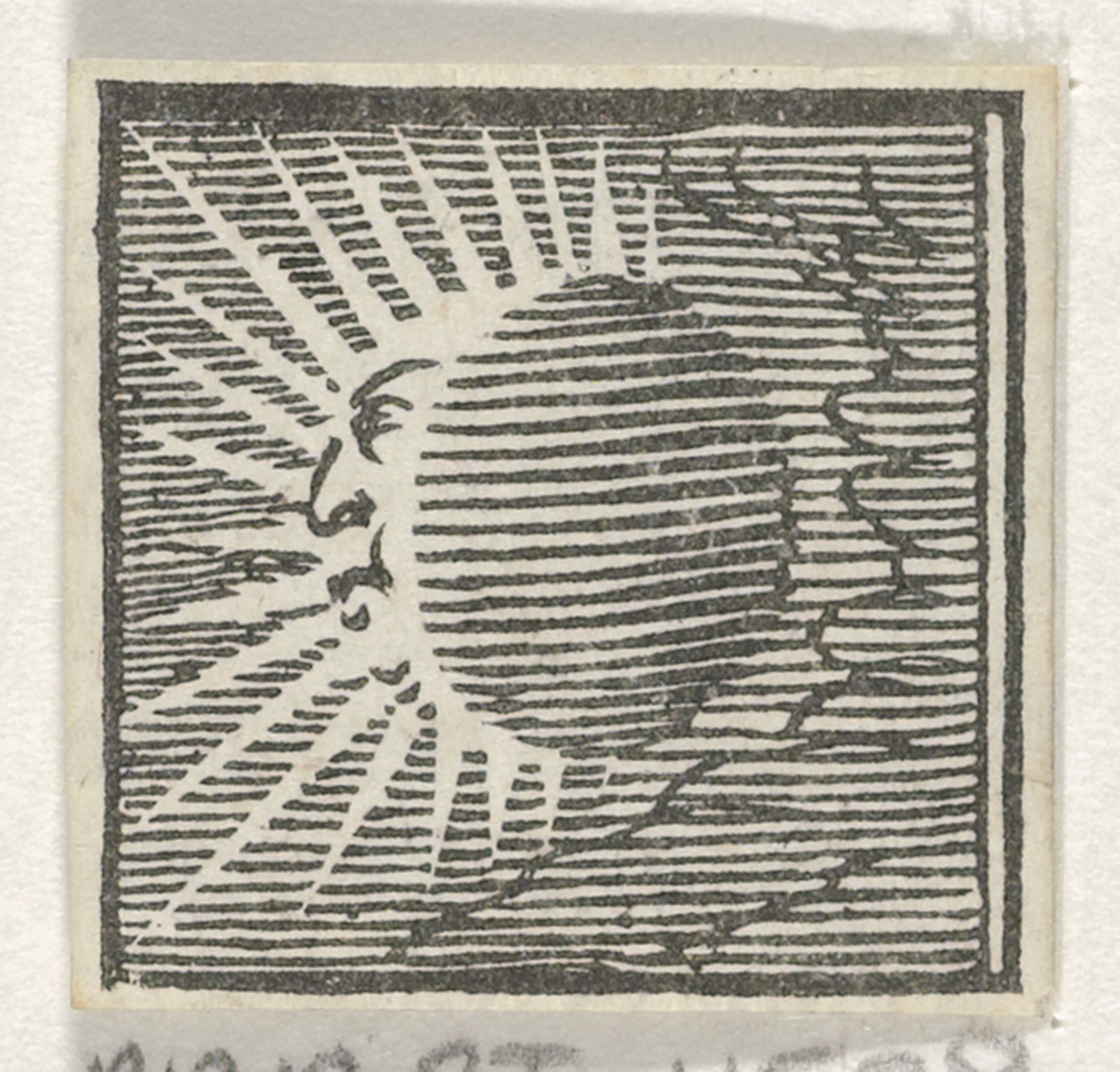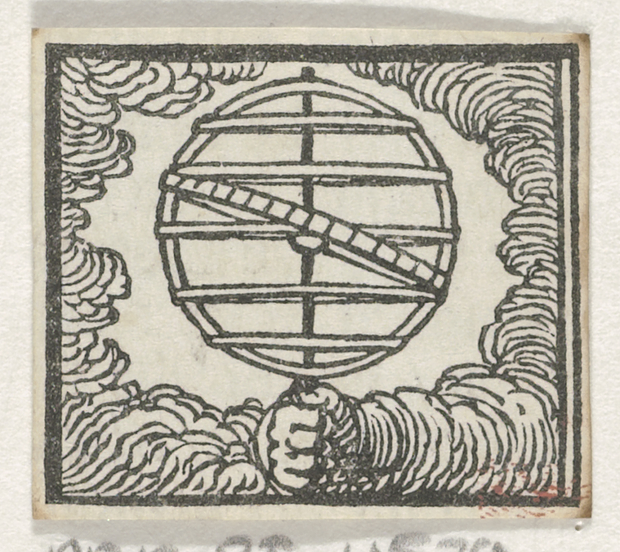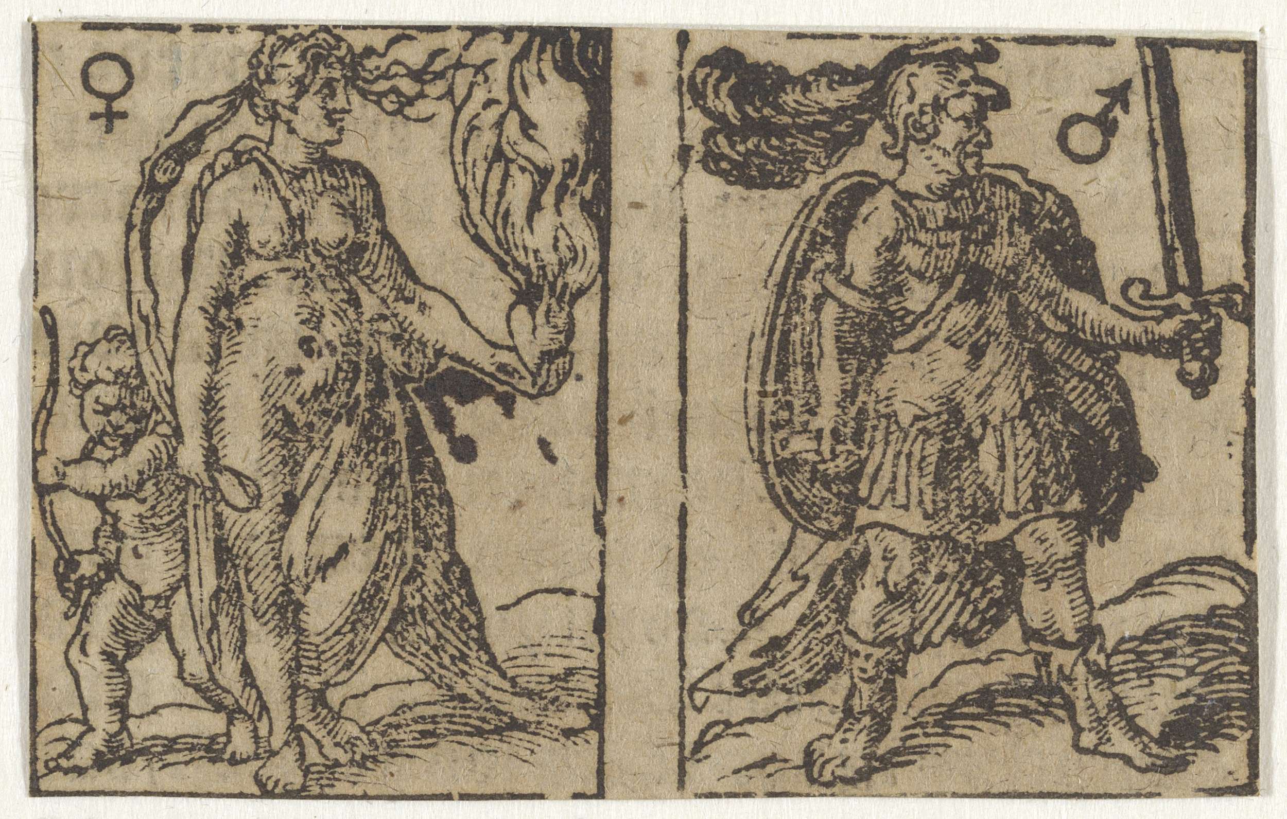 Vignet met een hartvorm en een kasteel, twee putti e...