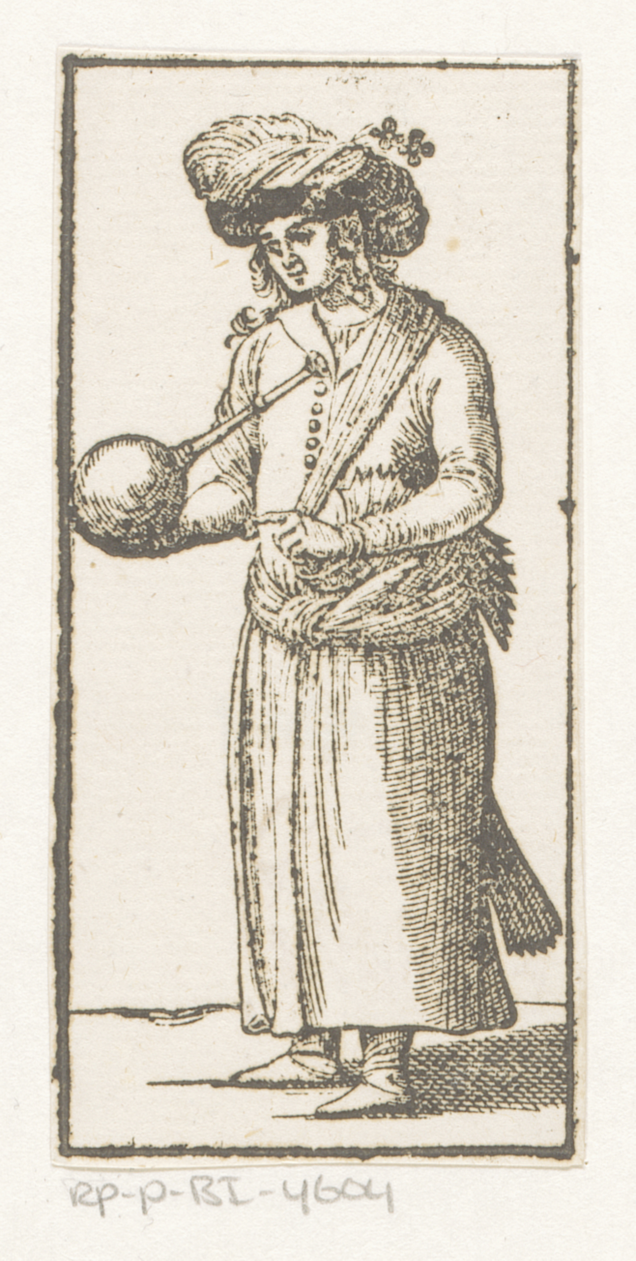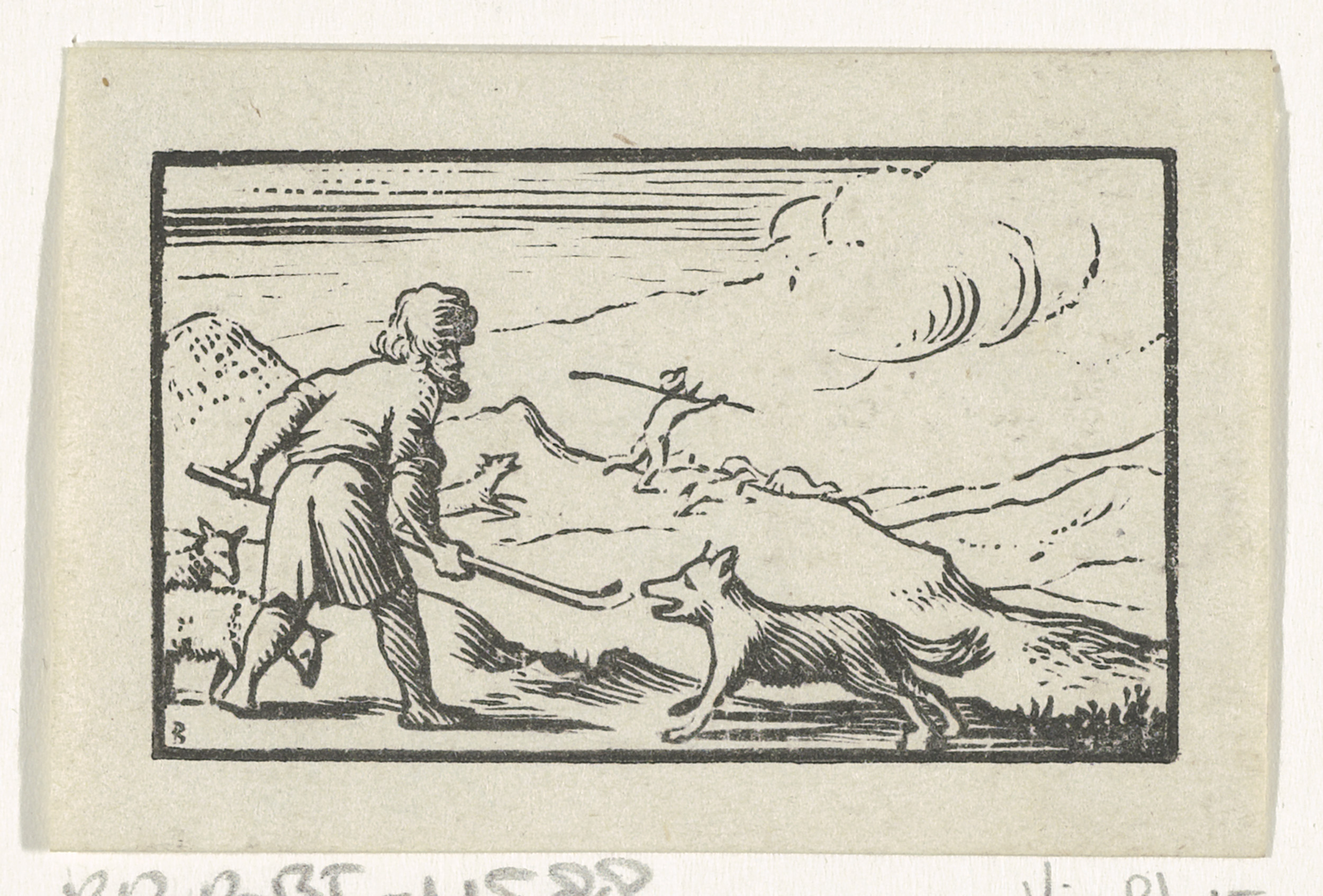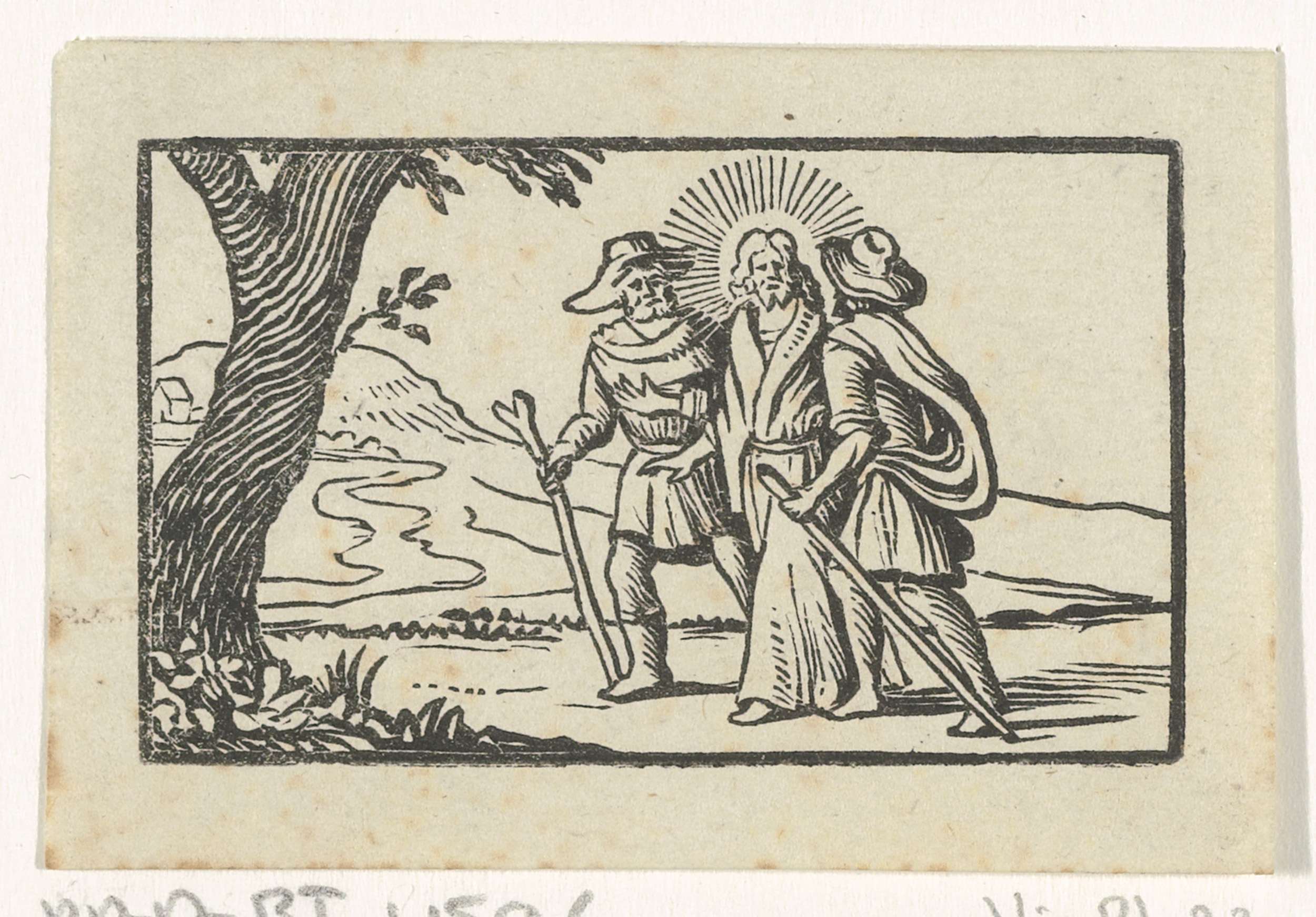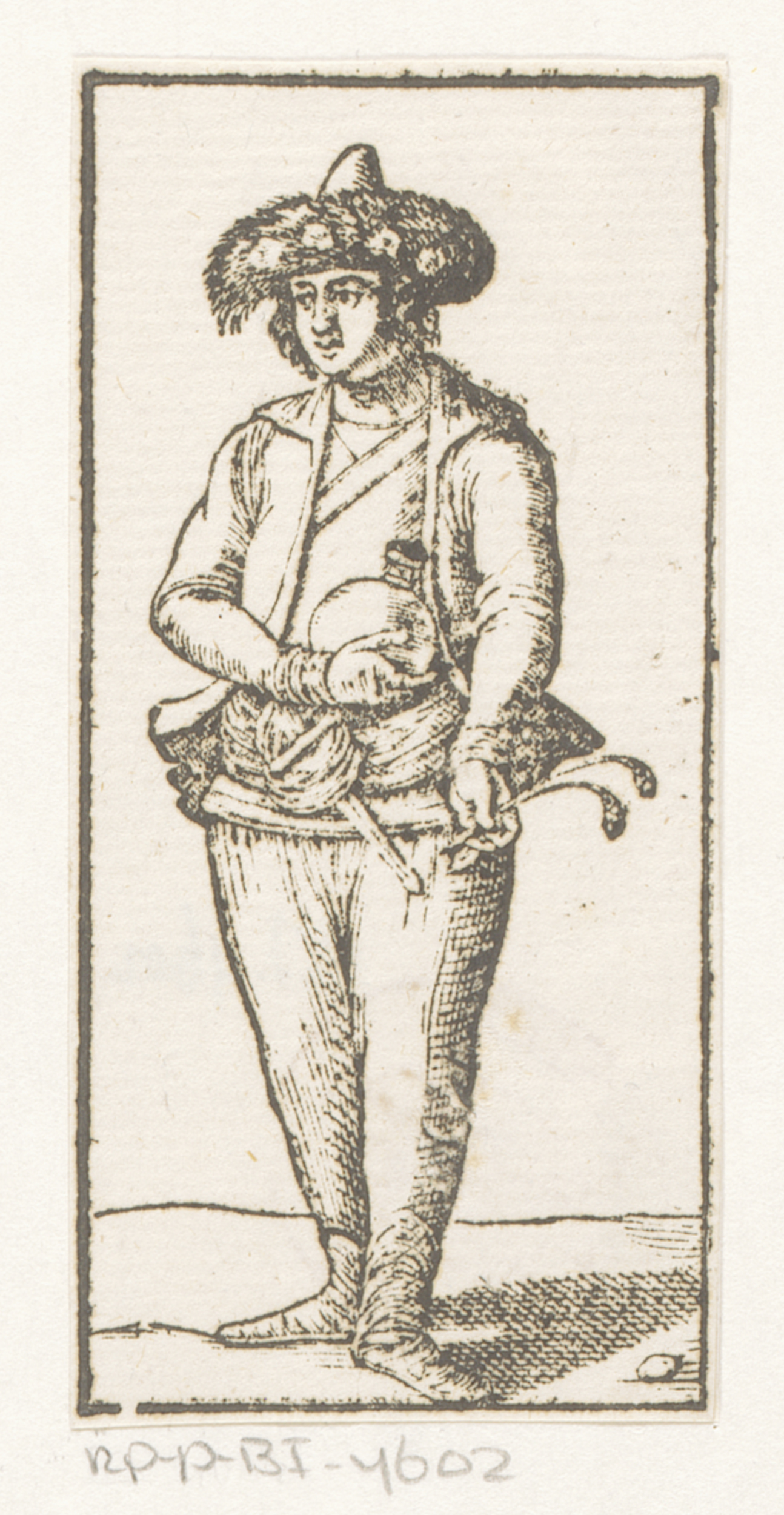 Pelgrim met houten been en krukken kijkt naar een dr...