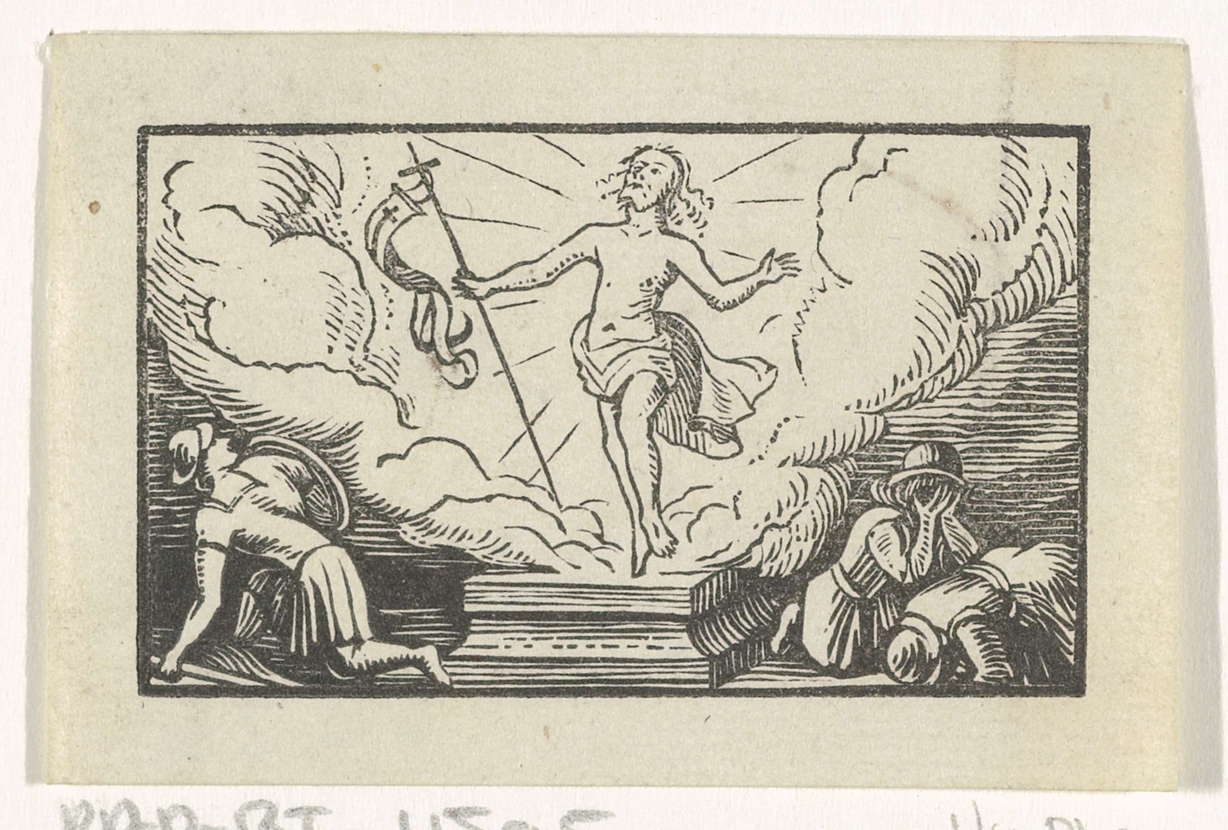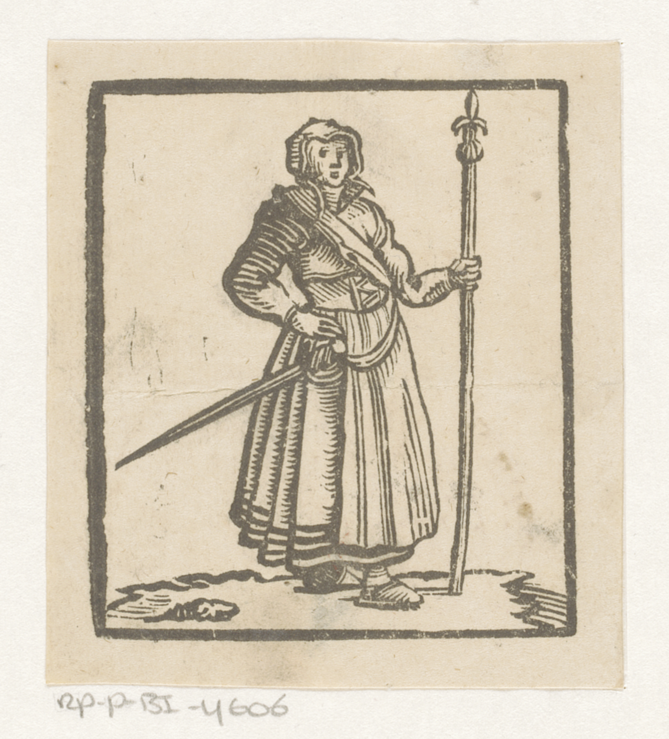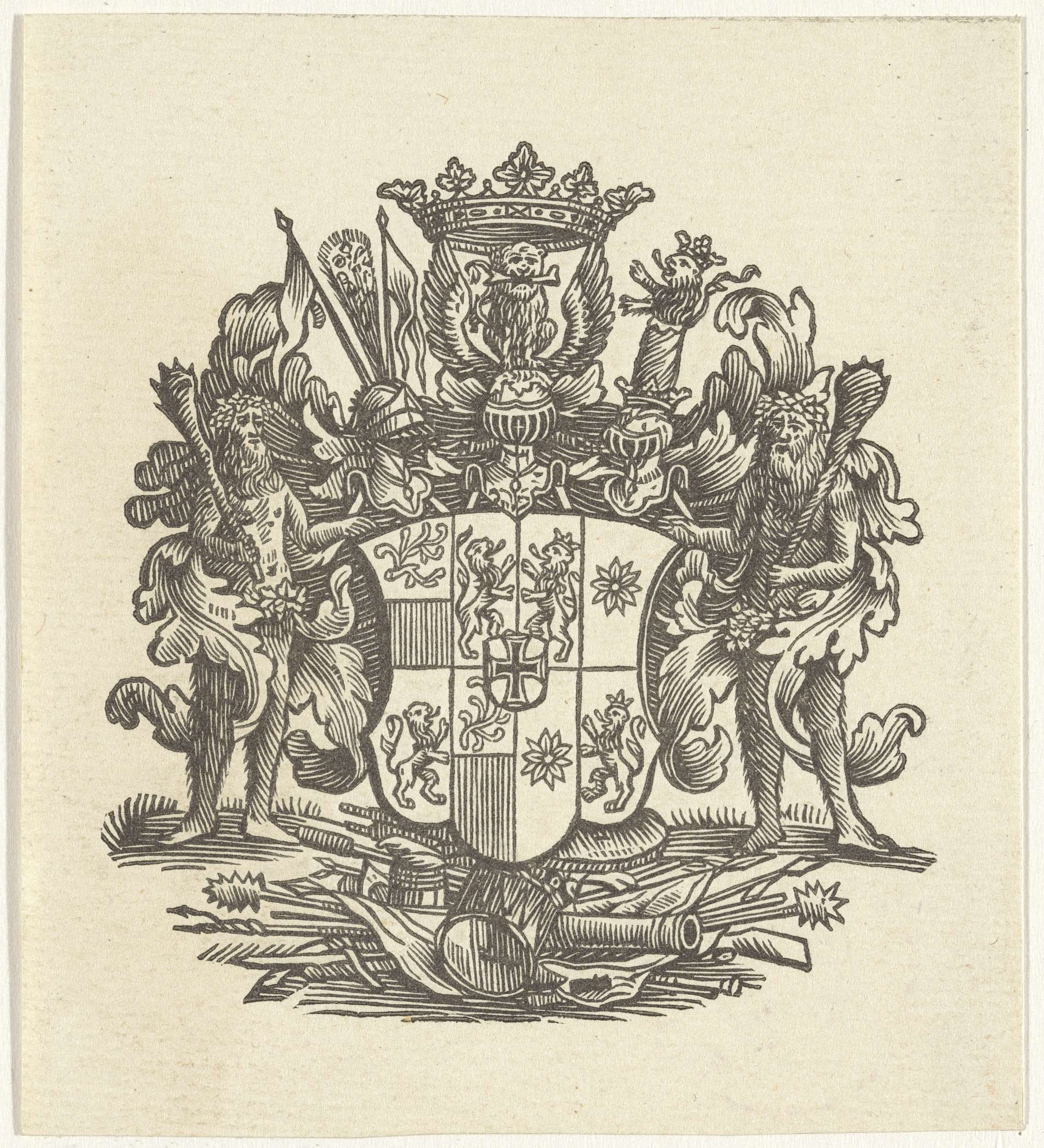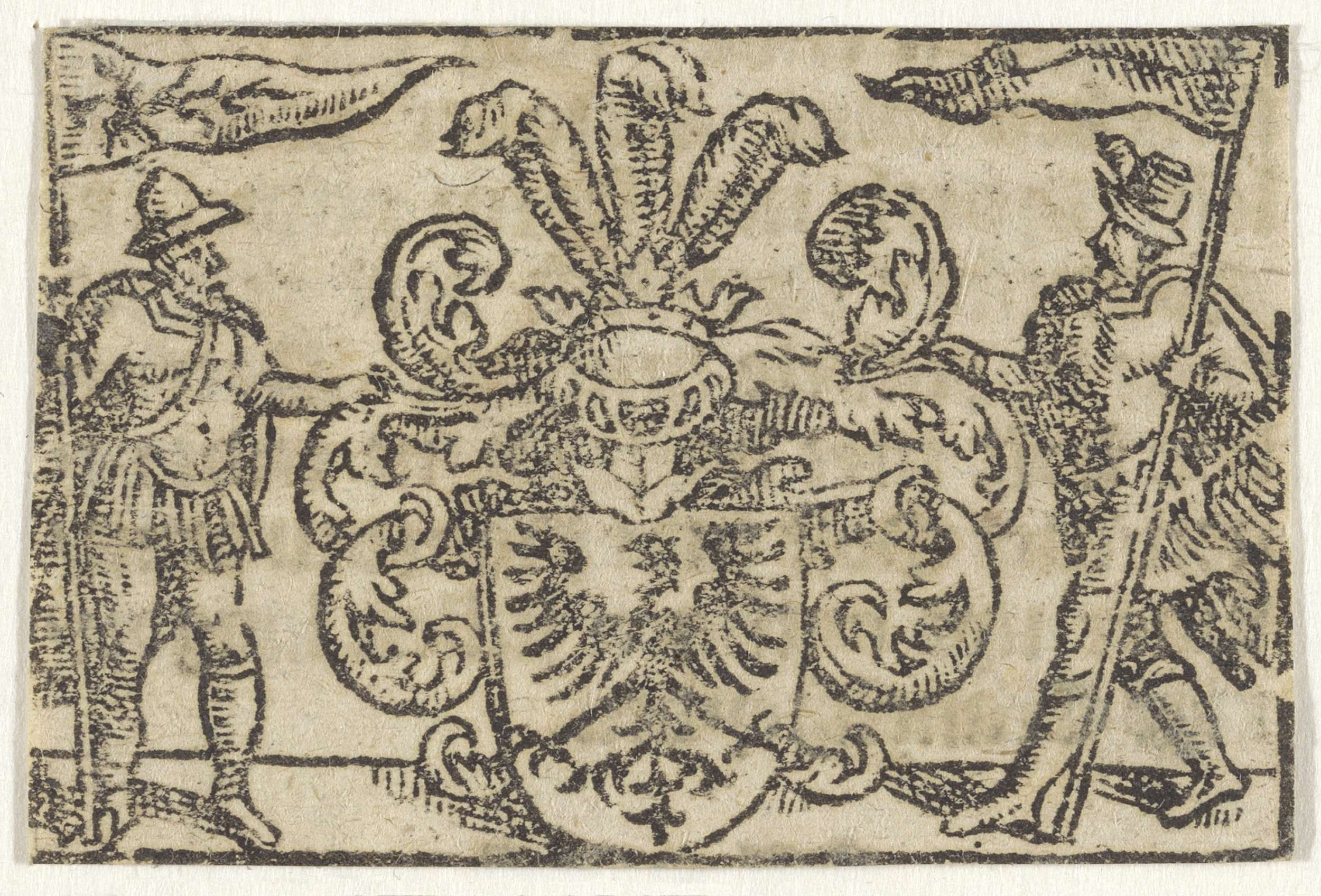 Twee vaandeldragers en een wapen met daarop een zwar...