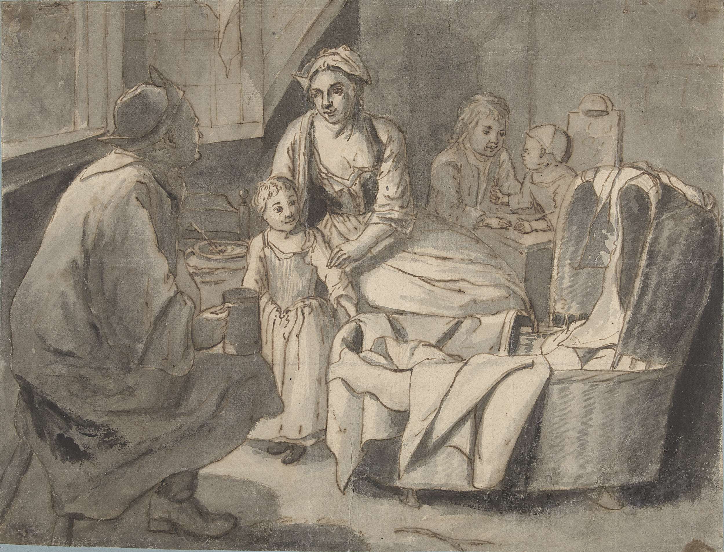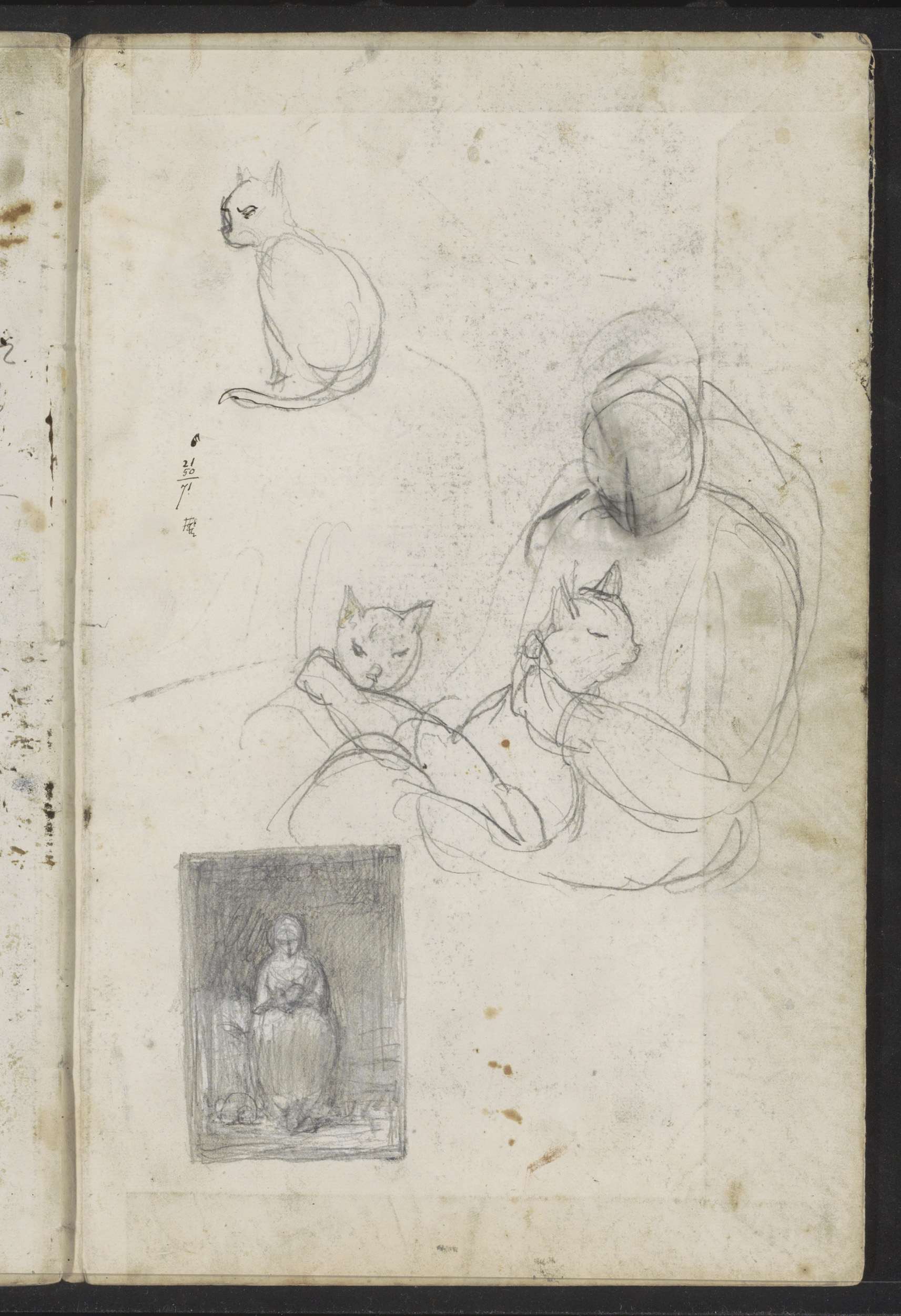 Katten, een handwerkende vrouw en een figuur met een...