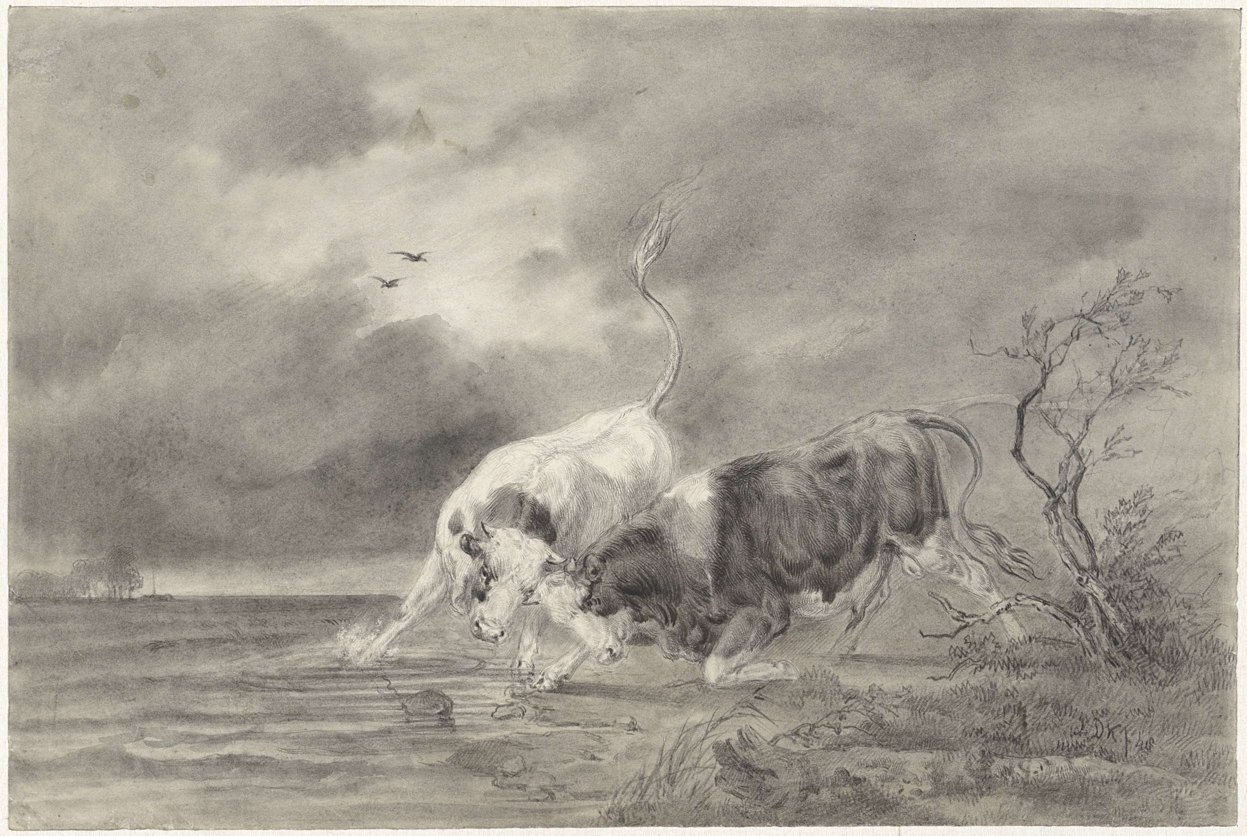 Twee vechtende stieren in een rivierlandschap