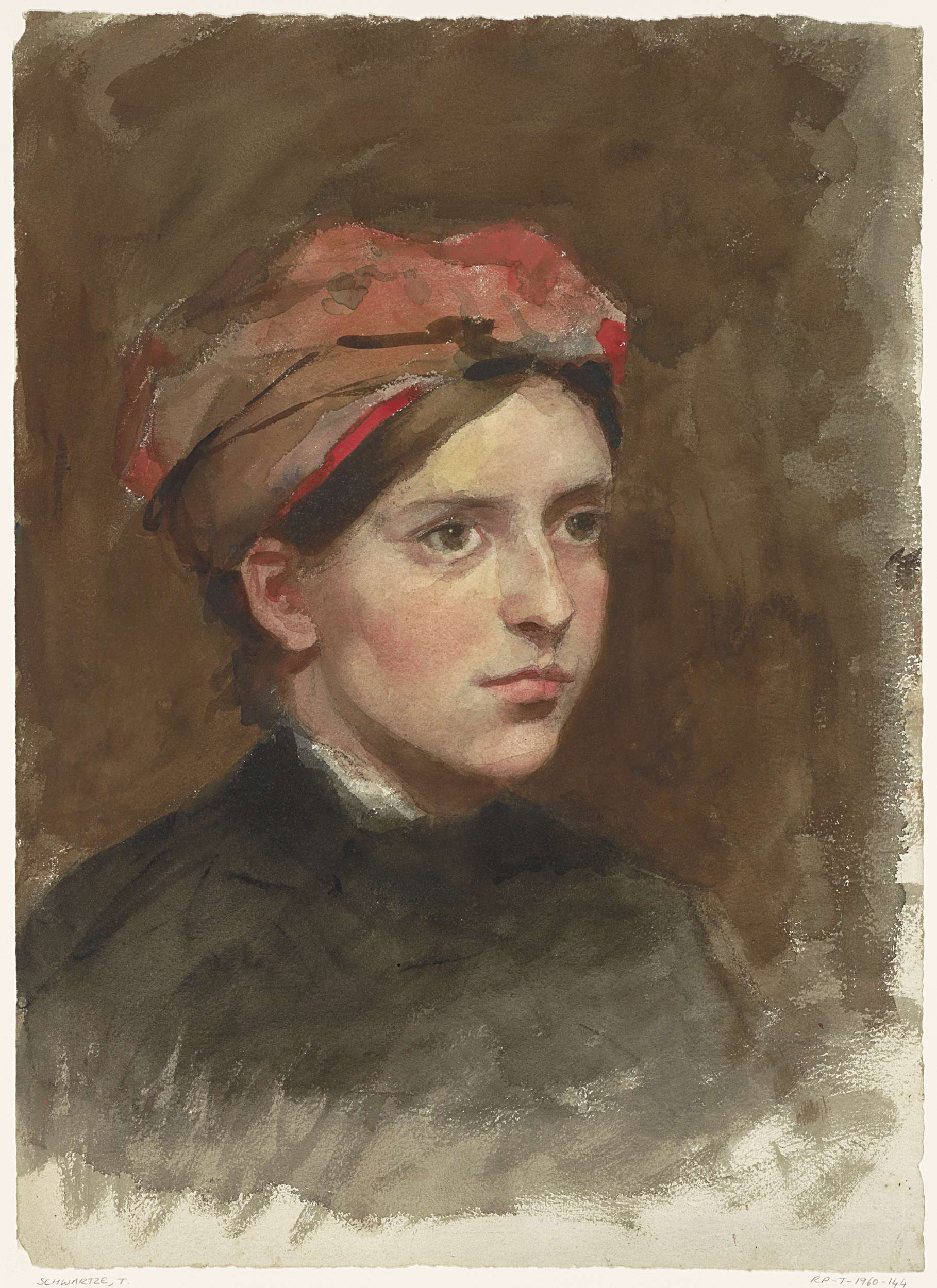 Portret van een jonge vrouw met een rode hoofddoek